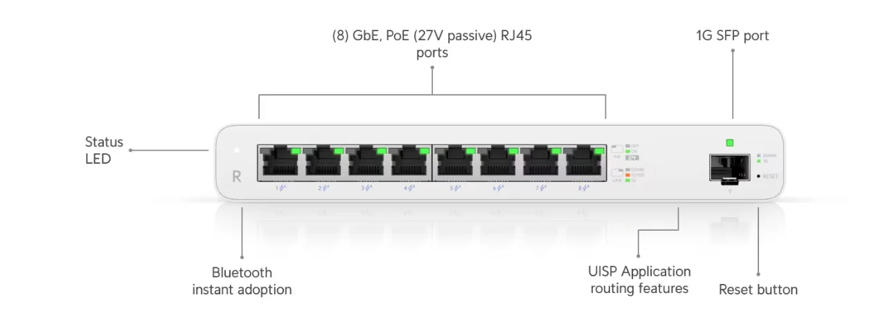 Ubiquiti UISP Router (UISP-R) to gigabitowy router PoE zaprojektowany z myślą o aplikacjach MicroPoP, wyposażony w 8 portów Gigabit Ethernet PoE oraz 1 slot SFP dla dodatkowej opcji łącza nadrzędnego. Jest to idealne rozwiązanie dla bezprzewodowych wdrożeń ISP (WISP), umożliwiające szybkie i ekonomiczne dostarczanie gigabitowych prędkości bezprzewodowych.