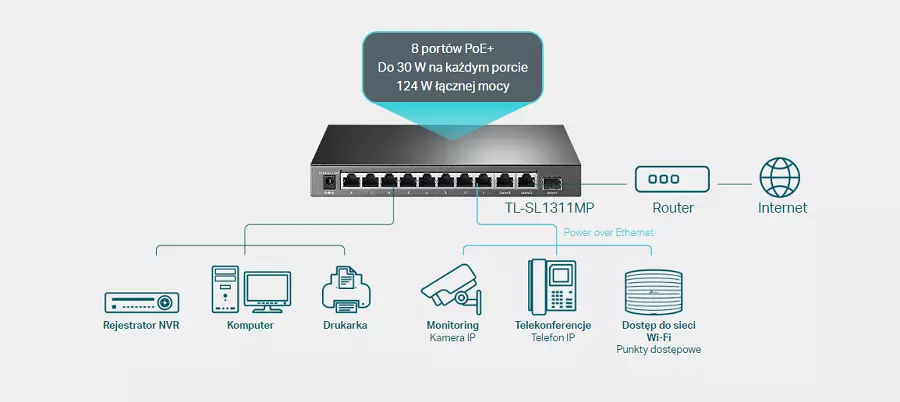 - Do 124 W łącznej mocy PoE do wykorzystania na 8 portach 8 PoE*.