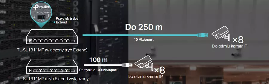 Dzięki trybowi Extend Mode odległość transmisji PoE sięga nawet 250 m** - idealne rozwiązanie do instalacji kamer na dużych obszarach.