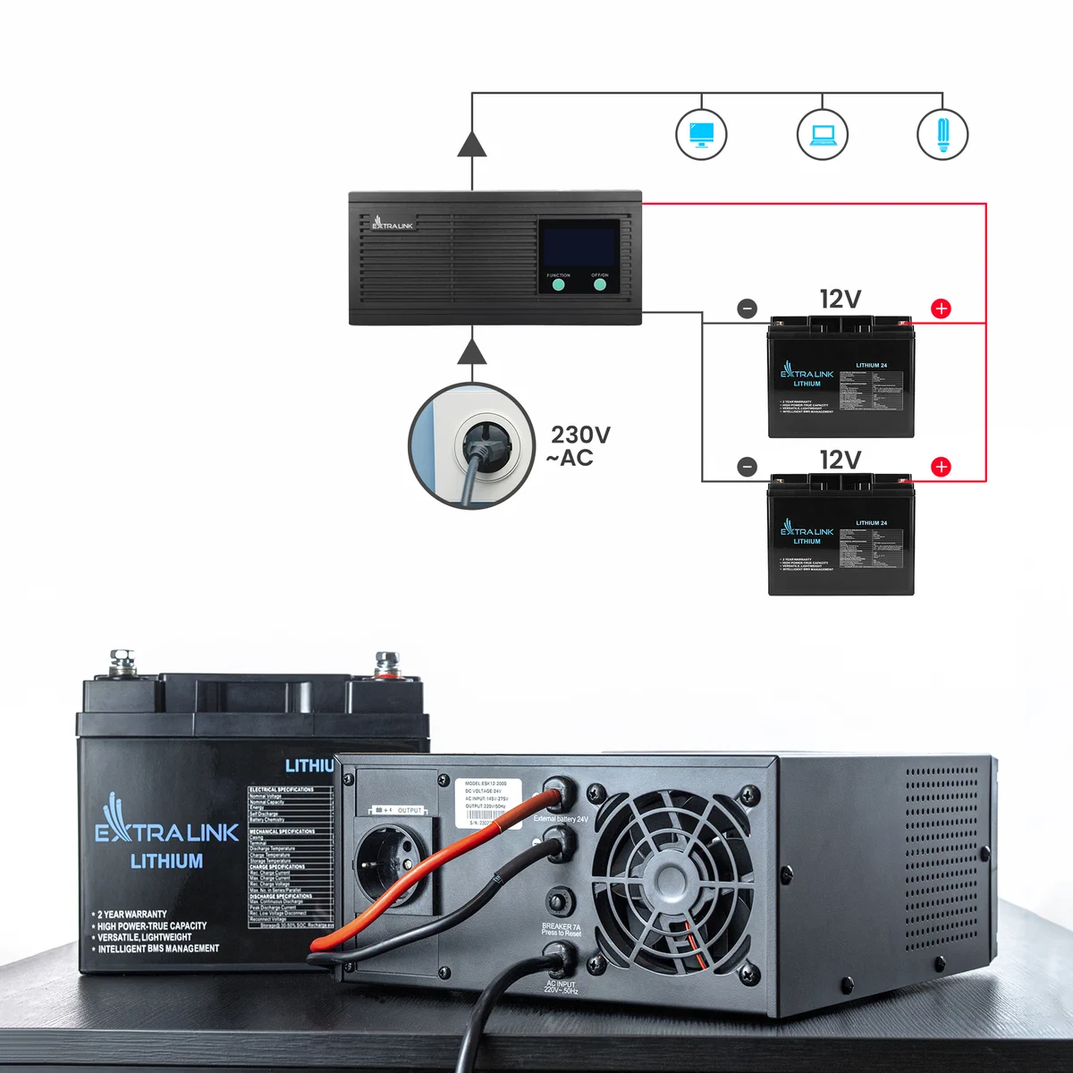 Zestaw Extralink Piorun 2000VA/1600W Inwerter + 2x Extralink LiFePO4 12.8V 40Ah Akumulator | Zasilacz awaryjny | Czysta sinusoid