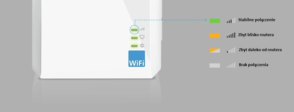 Wzmacniacz WiFi posiada diody informujące o sile sygnału sieci bezprzewodowej, pomagając dzięki temu określić odpowiednią lokalizację do umieszczenia urządzenia tak, aby uzyskać jak najlepszy możliwy zasięg i wysoką wydajność połączeń bezprzewodowych.