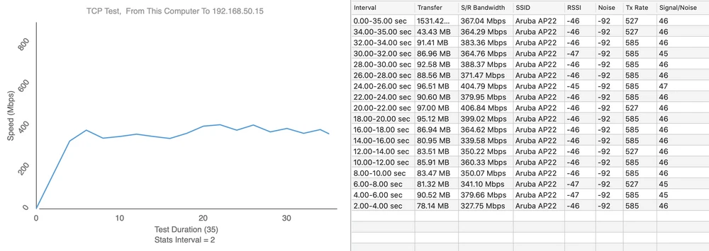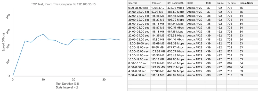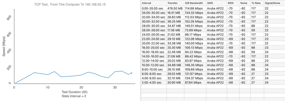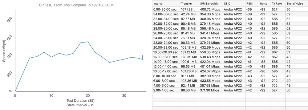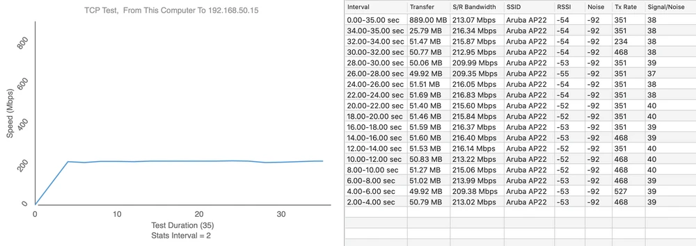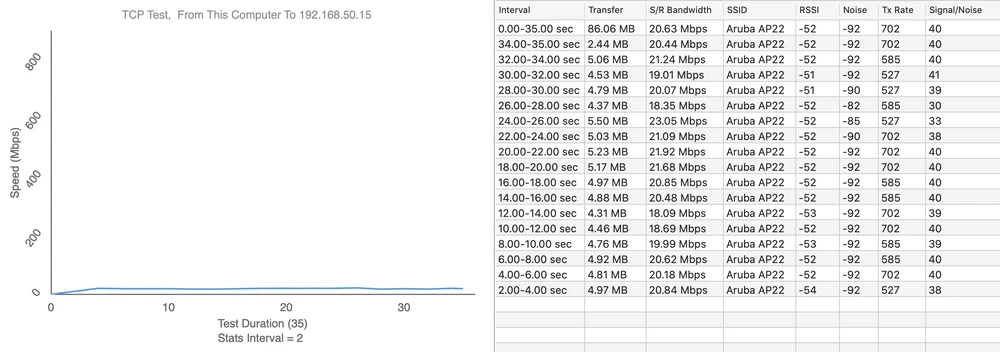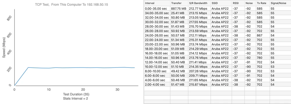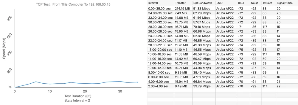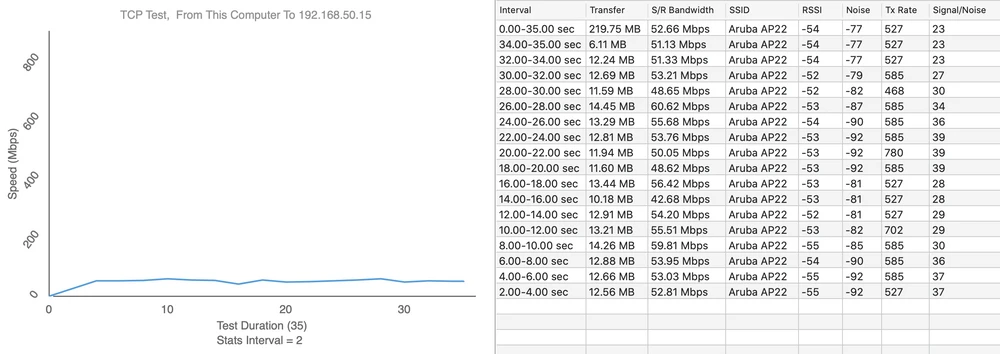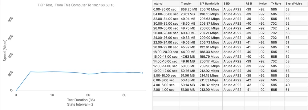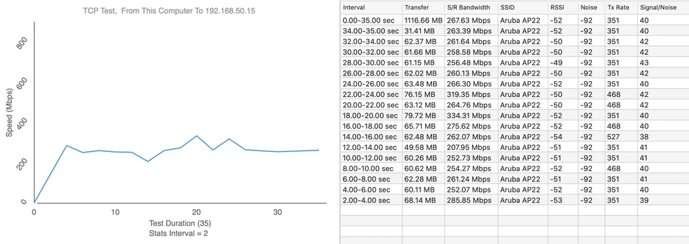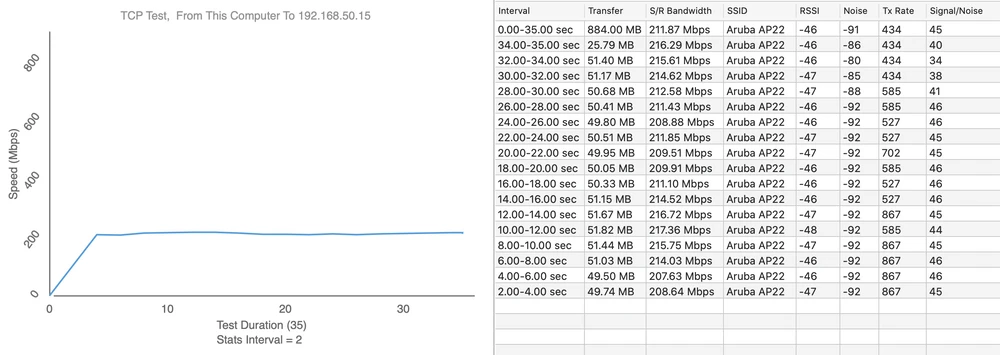 Naturalmente, para tornar os nossos testes de desempenho sem fio o mais confiável possível, fizemos uma série completa de medições de velocidade. Os testes foram realizados utilizando a aplicação WiFiPerf, e o servidor de testes de velocidade foi o software iperf3. Toda a série de testes foi realizada utilizando o protocolo TCP, ciclo de duração de 60 segundos. Abaixo apresentamos os resultados das velocidades obtidas na rede sem fio construída com Aruba Instant On AP22. O maior valor em cada ciclo foi levado em conta.