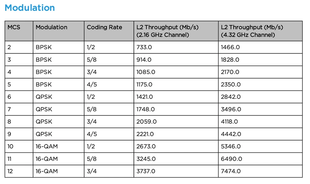 velocidades de até 2 Gbps com ligação de canais, ou seja, 1 Gbps de uplink / 1 Gbps de downlink. Suporta largura de banda de 57 a 66 GHz. Permite varrimento horizontal de 80º e vertical de 40º. Fornece acesso aos canais TDMA/TDD e capacidades de sincronização de rede.