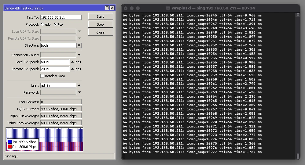Entretanto, durante a simulação do tráfego TCP a 500/200M ping - o tempo de resposta entre os dispositivos testados estava ao nível de: