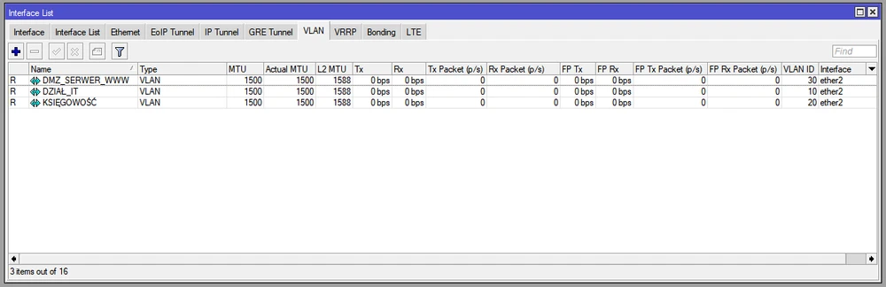E, claro, todas as VLANs: DZIAL_IT(vlan 10); KSIEGOWOSC(vlan 20); DMZ_SERWER_WWWW(vlan 30).