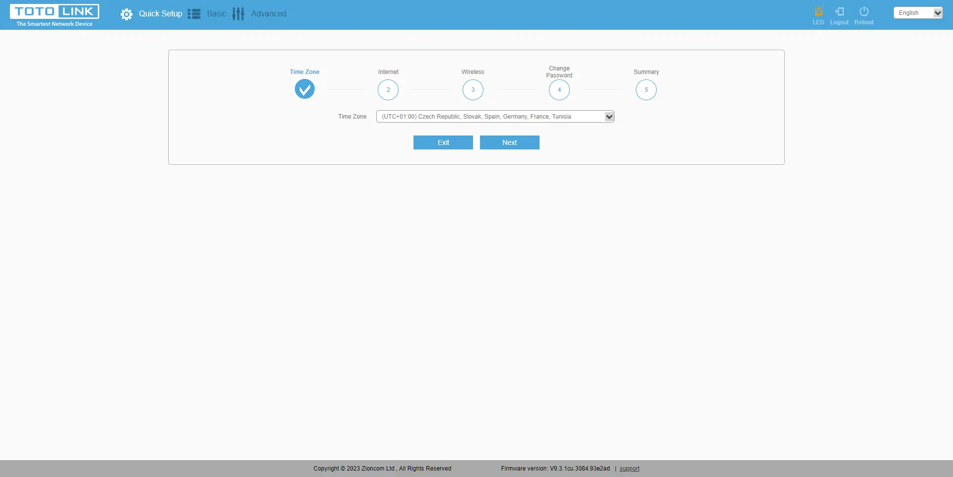 Depois de iniciar sessão com sucesso, será recebido por um assistente de configuração rápida. A primeira coisa que sugere é a definição do fuso horário. O fuso horário é muito importante se não for definido corretamente - algumas aplicações e sítios Web podem não funcionar corretamente ou não funcionar de todo.