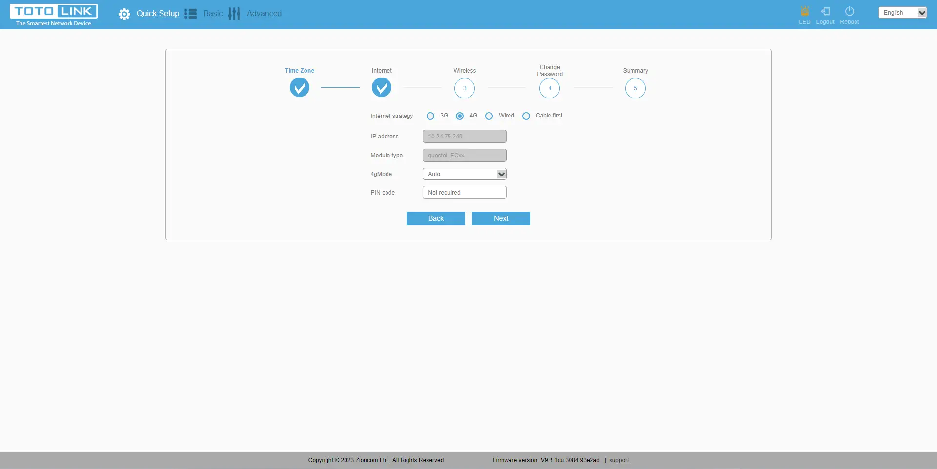 A segunda coisa que temos de escolher é selecionar o método de ligação prioritária à Internet. No nosso caso, é 4G. O router mostra imediatamente o nosso endereço IP externo e o tipo de módulo. Também lhe é pedido que seleccione e configure manualmente o '4gMode', onde podemos configurar o APN (normalmente necessário se tivermos definições individuais do operador). Também podemos introduzir o PIN do cartão SIM (mas já o retirámos anteriormente do cartão SIM e não é necessário introduzir nada).