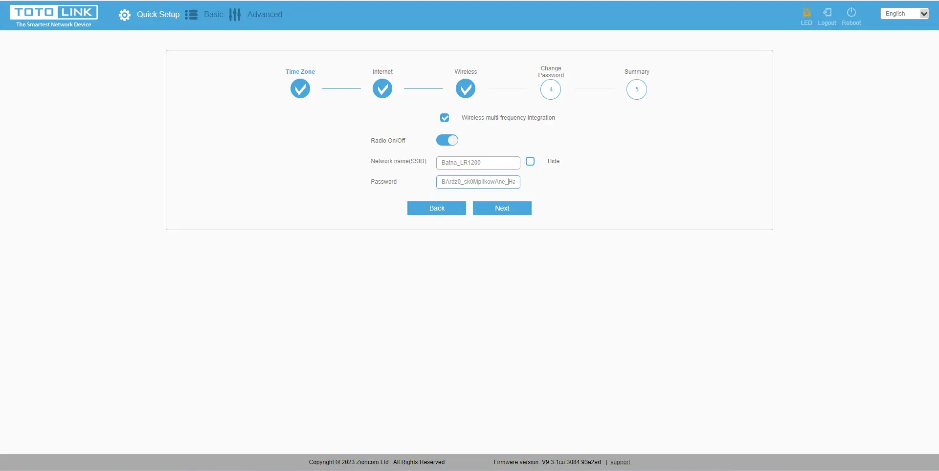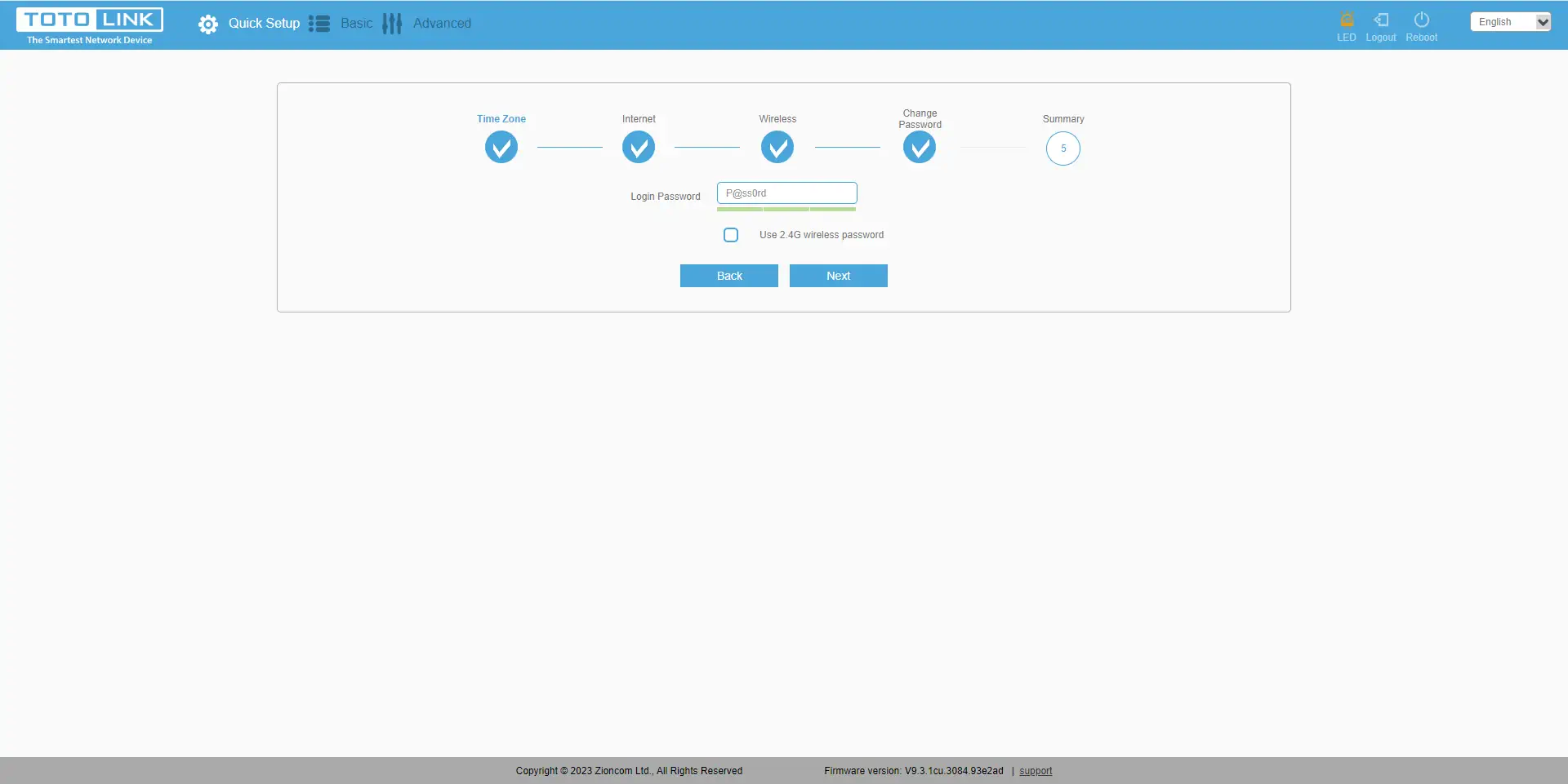 No quinto ponto, temos um resumo das nossas definições. Isto significa que podemos ver o nosso tipo de ligação, as definições Wi-Fi para 2,4 GHz e 5 GHz e a palavra-passe para iniciar sessão no dispositivo. Se algum dos itens quisermos alterar agora, podemos voltar atrás e alterar as definições. Se estiver satisfeito com todos os elementos, pode premir com segurança"Done" (Concluído).