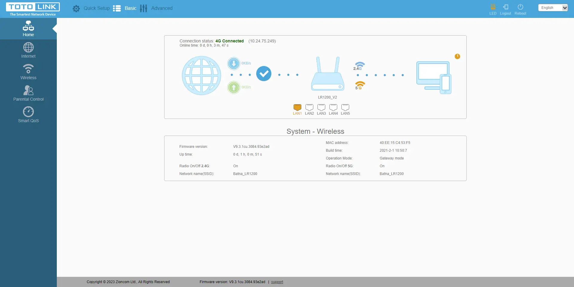Neste modo"Básico", podemos ver os dados básicos da ligação, a lista de dispositivos ligados e a velocidade atual de transferência de dados. Também no separador "Internet", podemos alterar o método de ligação à Internet. O separador "Sem fios" permite-nos configurar o Wi-Fi. O "Controlo parental" permite-nos configurar um horário em que o dispositivo selecionado só terá acesso à Internet a horas específicas. O separador "QoS inteligente" permite dar prioridade aos vários dispositivos ligados, ou seja, dar prioridade à taxa de dados para a Internet.