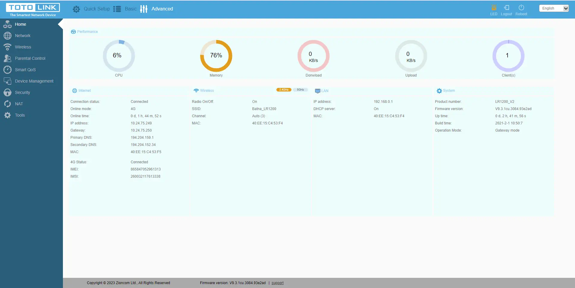 O Totolink LR1200 é um router bastante simples, económico, comum e fiável com um modem LTE cat.4, que permite velocidades de download de informação até 150Mbit e velocidades de upload até 50Mbit. Para atingir estas velocidades, o router tem 2 antenas LTE externas com ganho de 5dBi.