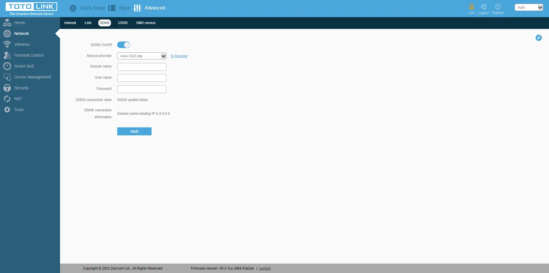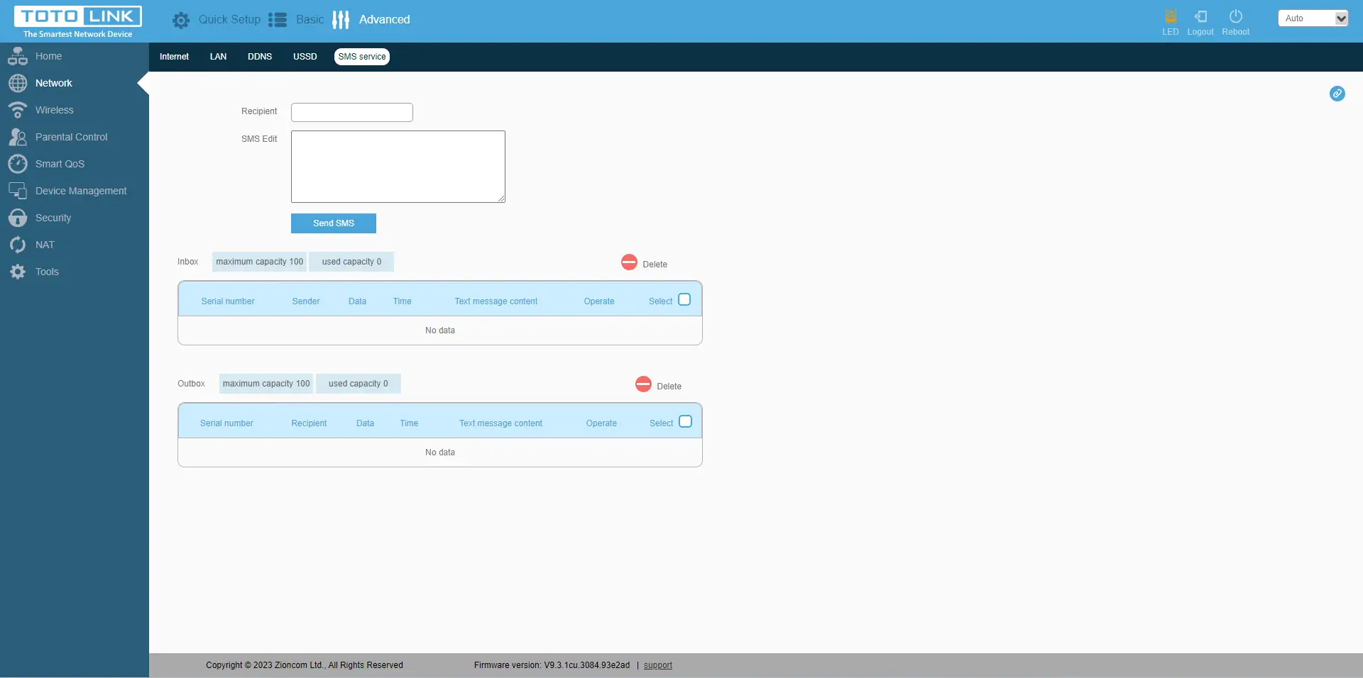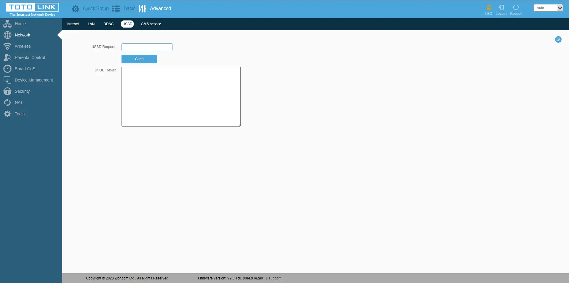 O separador seguinte"Rede" dá-nos opções como: configurar o tipo de ligação à Internet, configurar o APN, introduzir o PIN; configurar o endereço do router local, ativar o DHCP e o tempo de reserva do endereço IP; ativar o servidor DDNS; enviar pedidos USSD ao operador e receber uma resposta; enviar e receber mensagens SMS.
