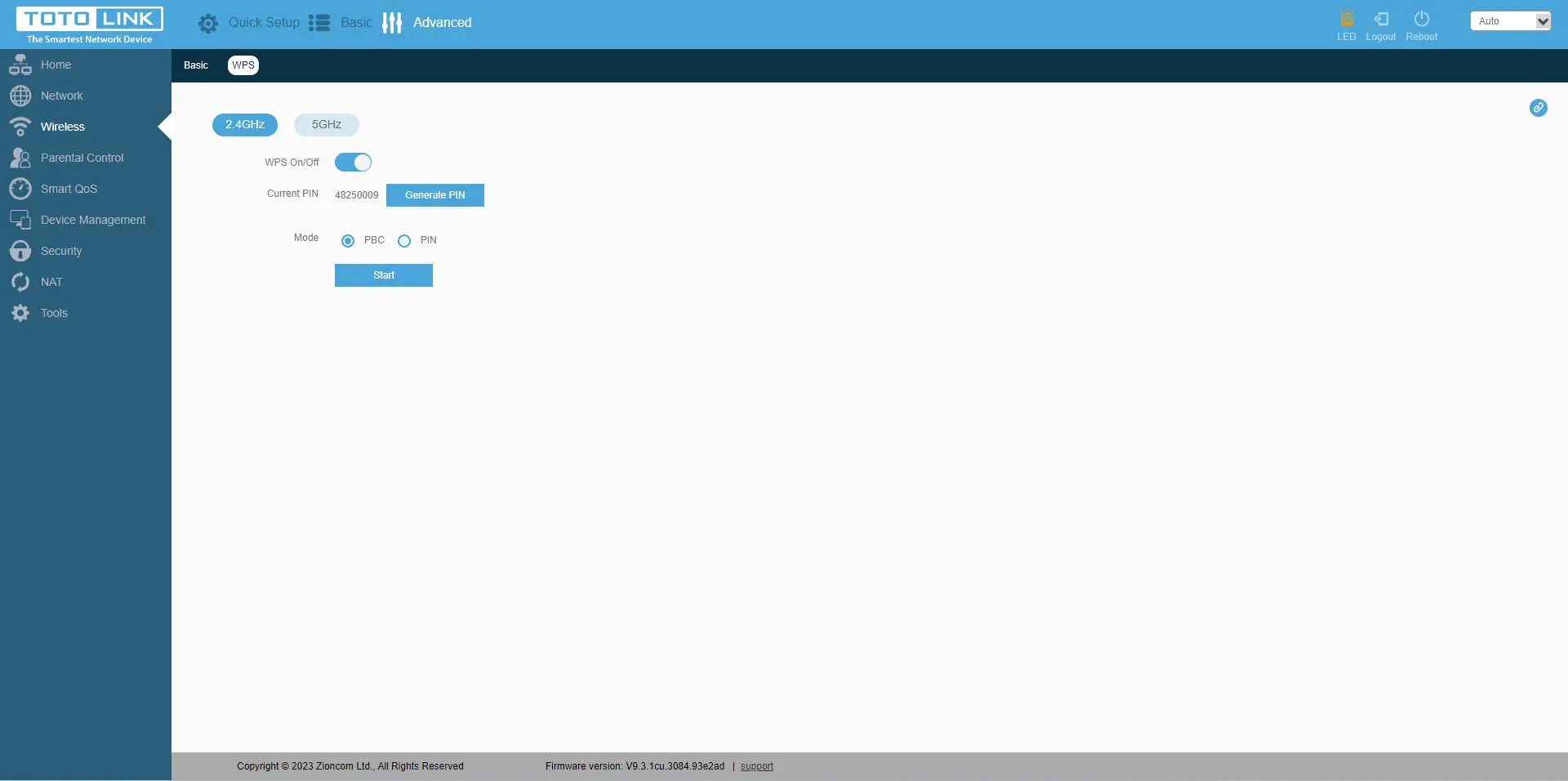 O separador"Wireless" (Sem fios) contém opções como a configuração da rede Wi-Fi, o nome da rede sem fios, a palavra-passe, a região, o canal para cada banda (2,4 GHz e 5 GHz); também é possível configurar o WPS, gerar o PIN.
