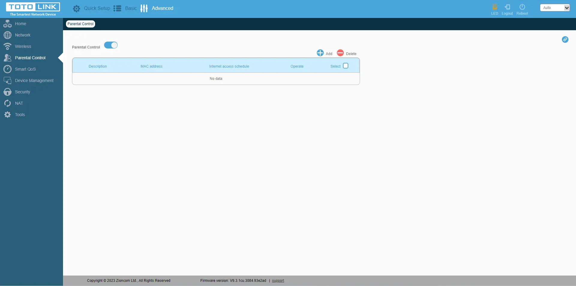 O separador"Parental Control" (Controlo parental) permite definir para um determinado dispositivo (por endereço MAC) o acesso à rede em horas e dias específicos, de acordo com a programação definida.