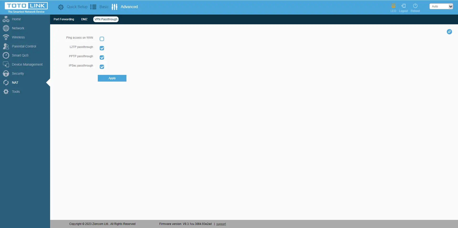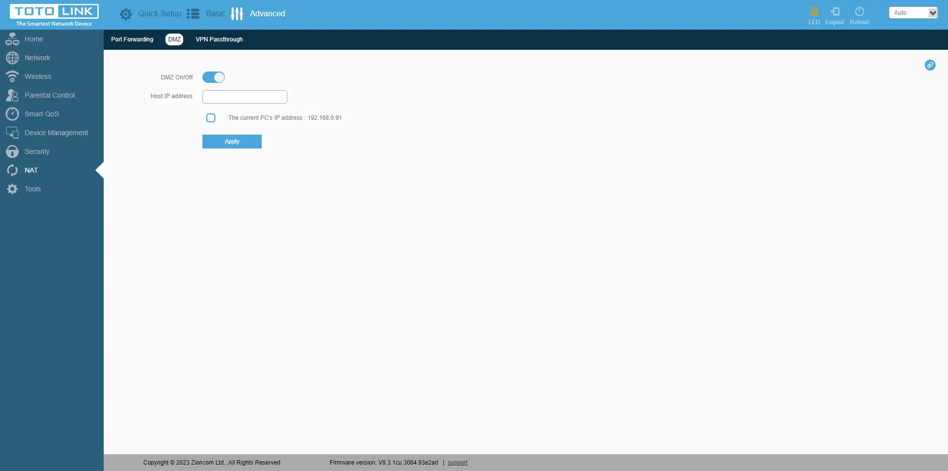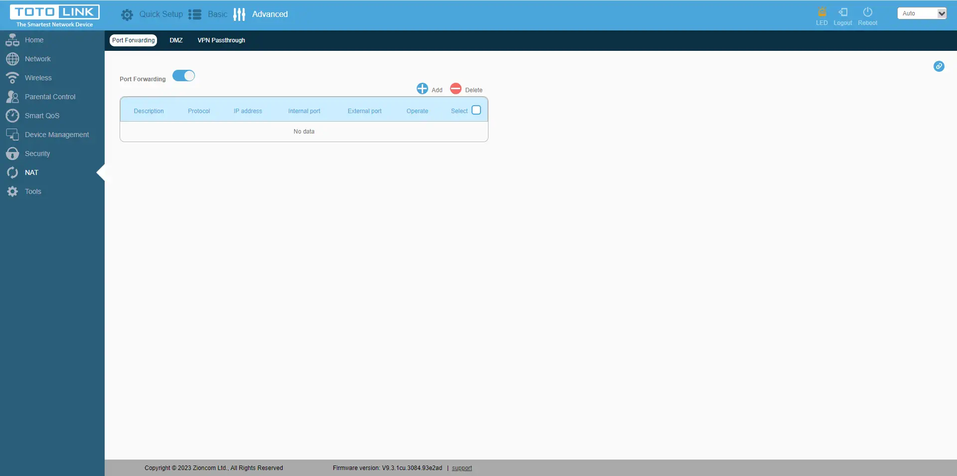 Outro separador"NAT" tem funções como Port Forwarding, DMZ, VPN Passthrough. O reencaminhamento de portas permite-lhe redirecionar as portas necessárias para portas externas no dispositivo, para que possa controlar os dispositivos a partir de qualquer parte do mundo. A DMZ permite-lhe reencaminhar todas as portas de um endereço IP selecionado a partir da rede local. O VPN Passthrough permite que os dispositivos da rede local criem canais VPN que passarão pelo router sem qualquer problema. Vale a pena lembrar que, para que todas estas funções funcionem, é necessário ter um endereço IP público na porta WAN ou no cartão SIM, que é um serviço separado associado ao seu operador.