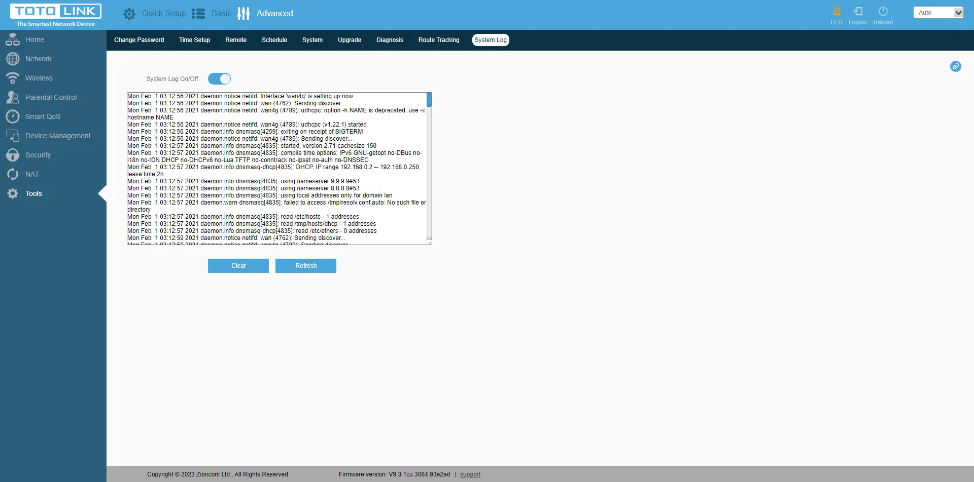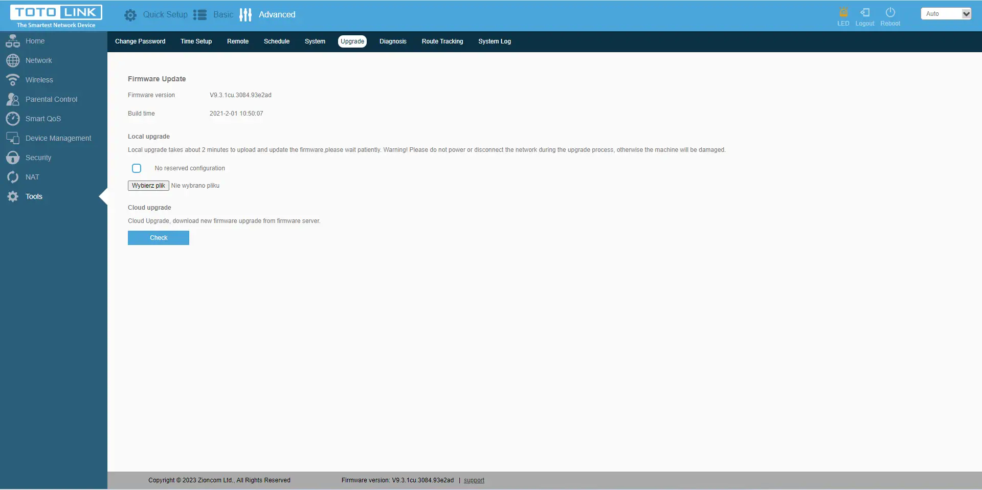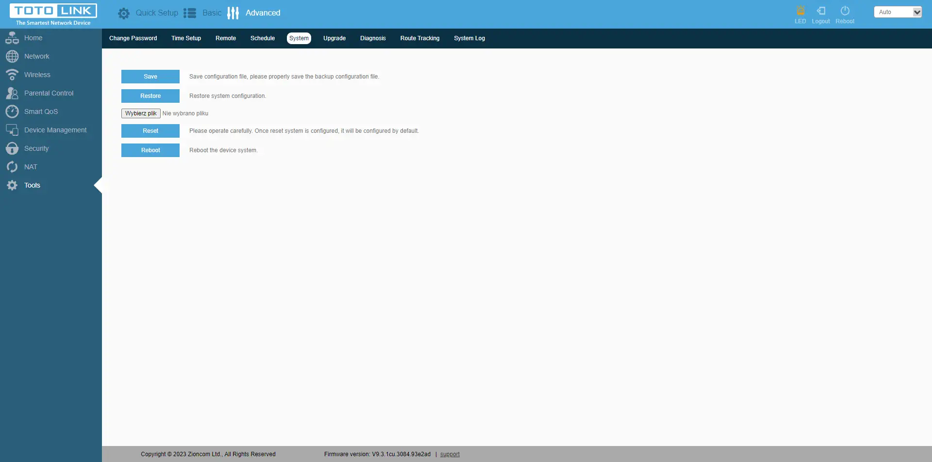 No último separador"Ferramentas" encontra também funções importantes, como alterar a palavra-passe do dispositivo, definir a data/hora e o fuso horário correctos, definir permissões para controlar remotamente o router numa porta específica, definir o horário de reinício do router, guardar/repor a configuração, reiniciar e repor o router. Também uma opção de atualização do firmware, capacidades de diagnóstico com os comandos Ping e Route Tracking. E, claro, a visualização dos registos do dispositivo.