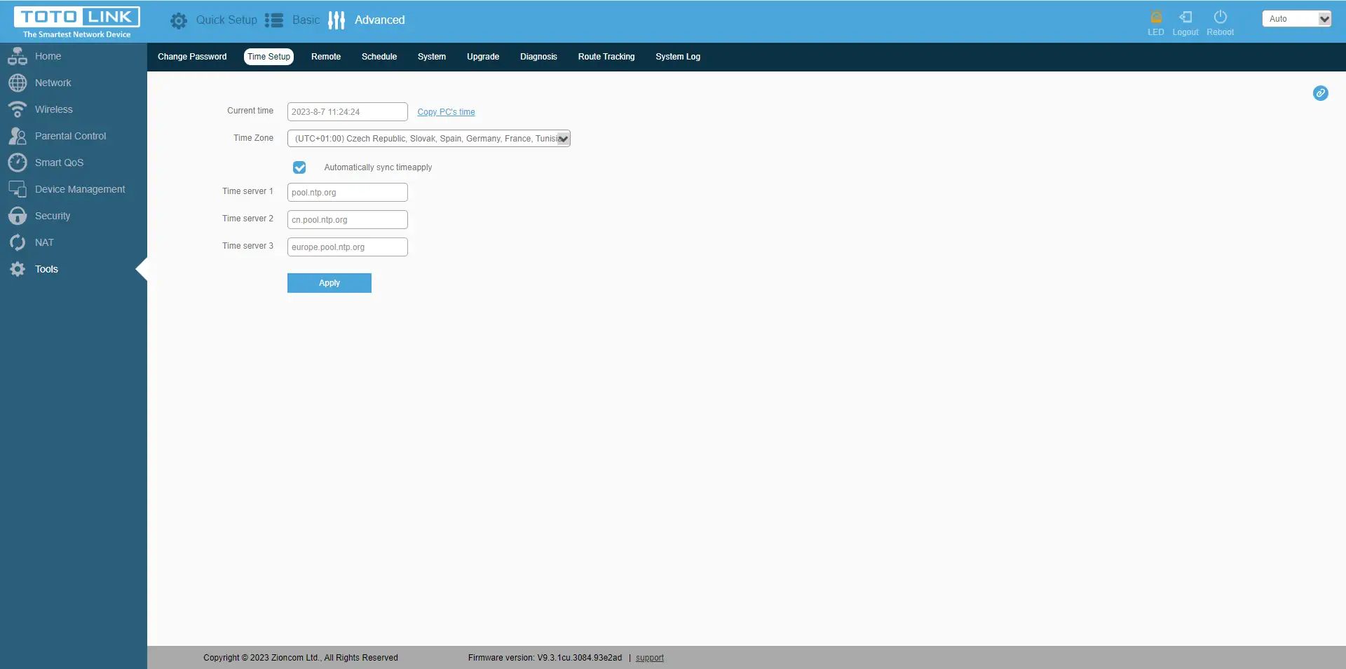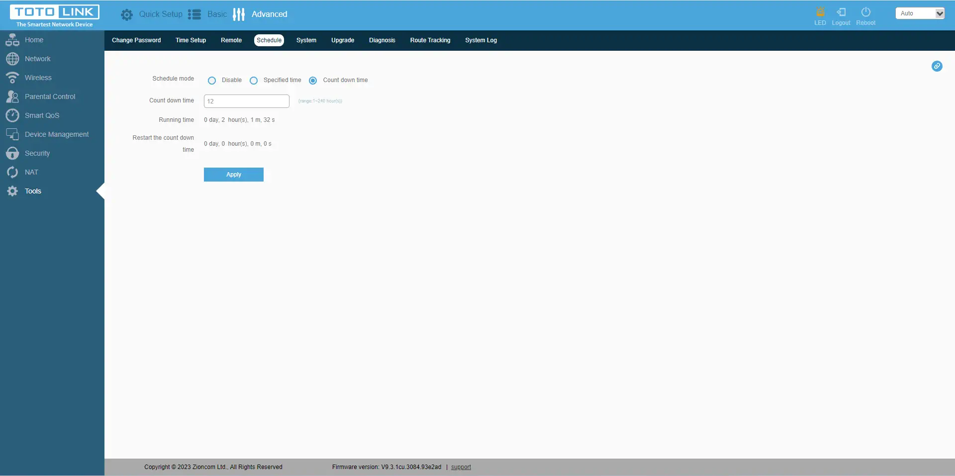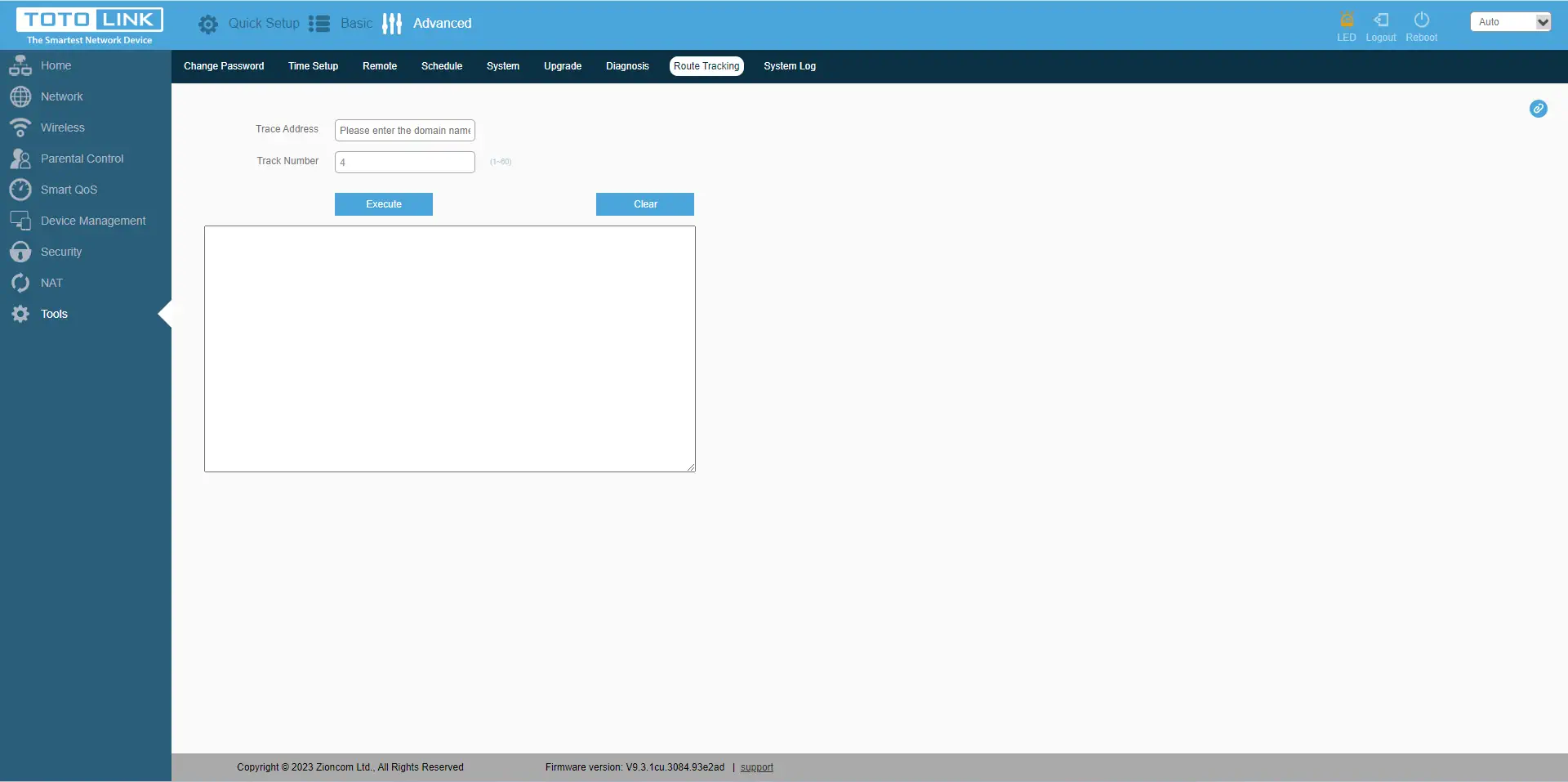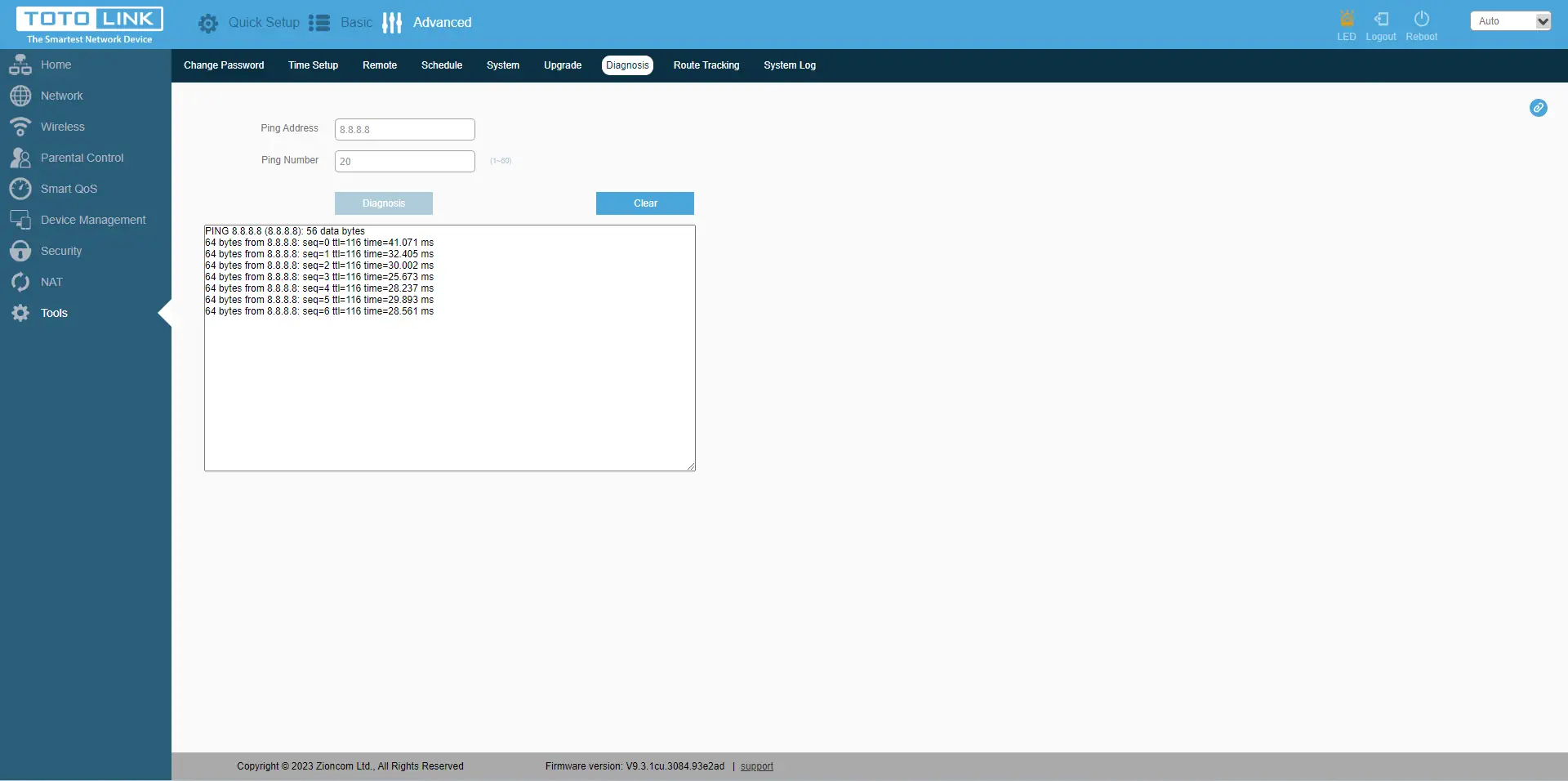 No último separador"Ferramentas" encontra também funções importantes, como alterar a palavra-passe do dispositivo, definir a data/hora e o fuso horário correctos, definir permissões para controlar remotamente o router numa porta específica, definir o horário de reinício do router, guardar/repor a configuração, reiniciar e repor o router. Também uma opção de atualização do firmware, capacidades de diagnóstico com os comandos Ping e Route Tracking. E, claro, a visualização dos registos do dispositivo.