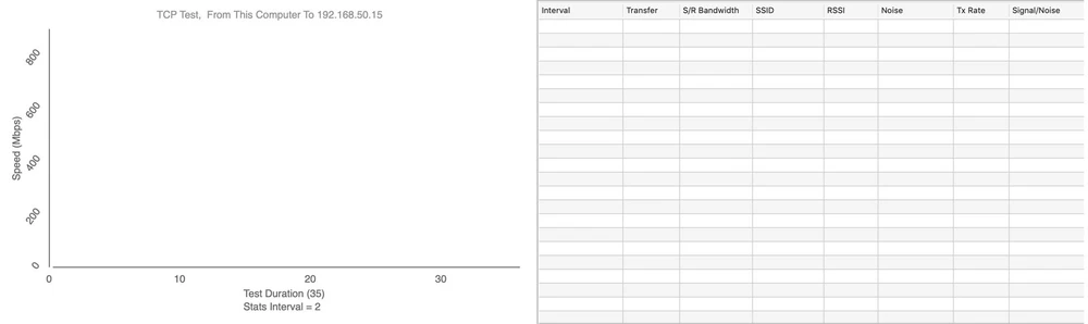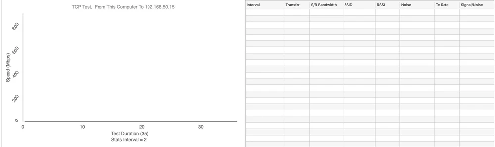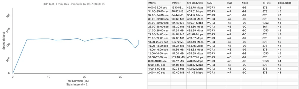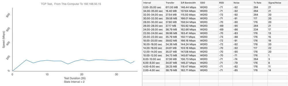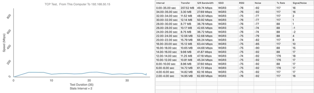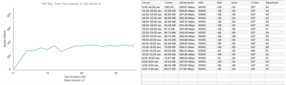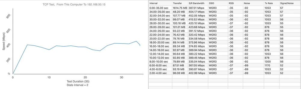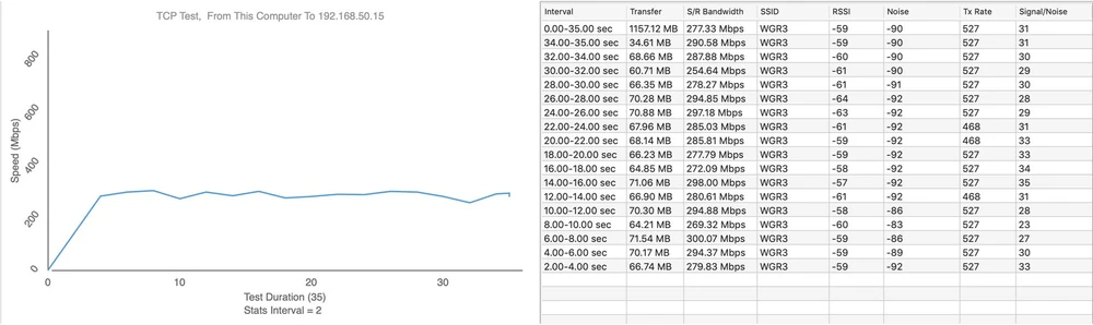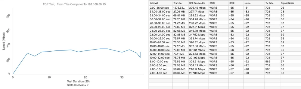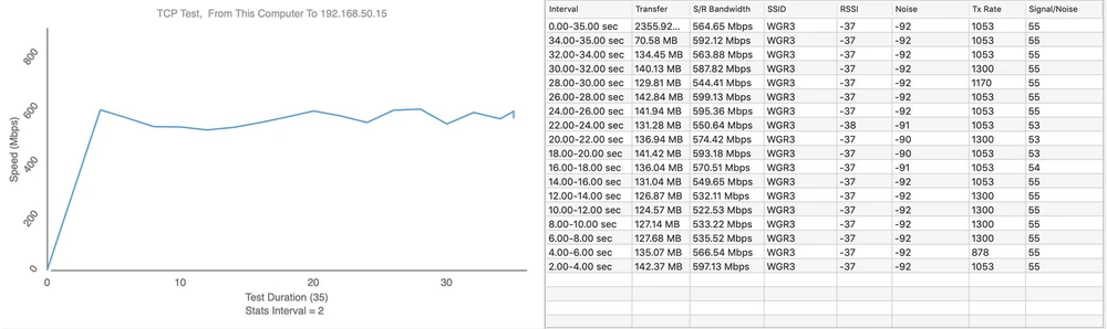 Infelizmente, devido à menor potência padrão de transmissão dos dispositivos (17dBm), não foi possível estabelecer um link MESH, como tinha sido o caso em testes anteriores.Antes do teste de velocidade, verificamos o desempenho máximo da LAN e do servidor iperf3.