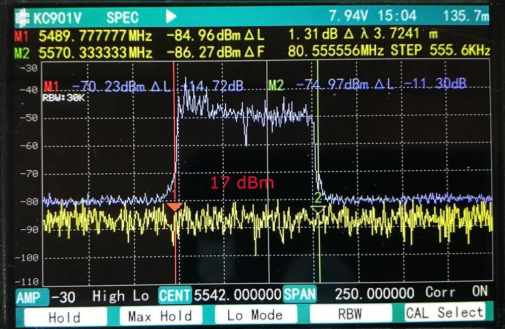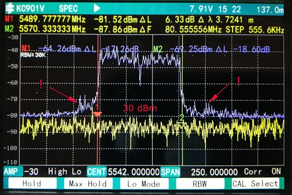 De acordo com o fabricante, a potência máxima de transmissão pode ser aumentada para 32dBm, a medição a 30dBm mostrou interferência adicional fora do canal de transmissão.