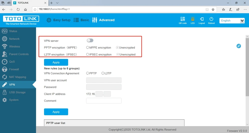 No momento a atualização do software é realizada através do mecanismo TFTP. Isto é muito fácil de fazer, e um guia detalhado passo a passo está disponível no nosso website. Claro que o ficheiro de firmware também está disponível para download no nosso website neste endereço - Totolink A3002RU-V2 GUI VPN SNMP IPERF Num futuro próximo, o firmware será carregado por defeito em todos os routers sem fios A3002RU-V2 adquiridos em www.batna24.com.