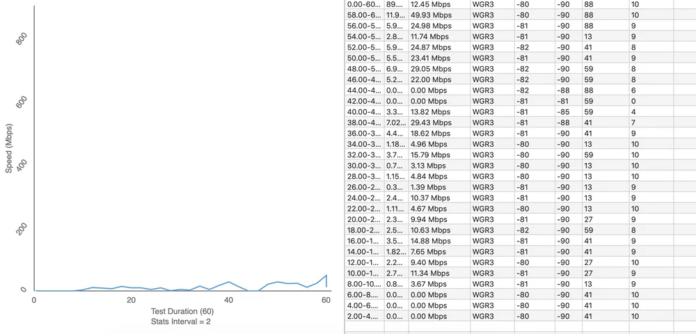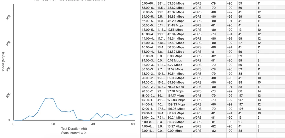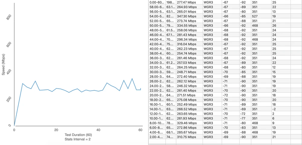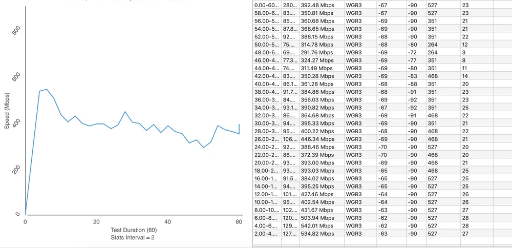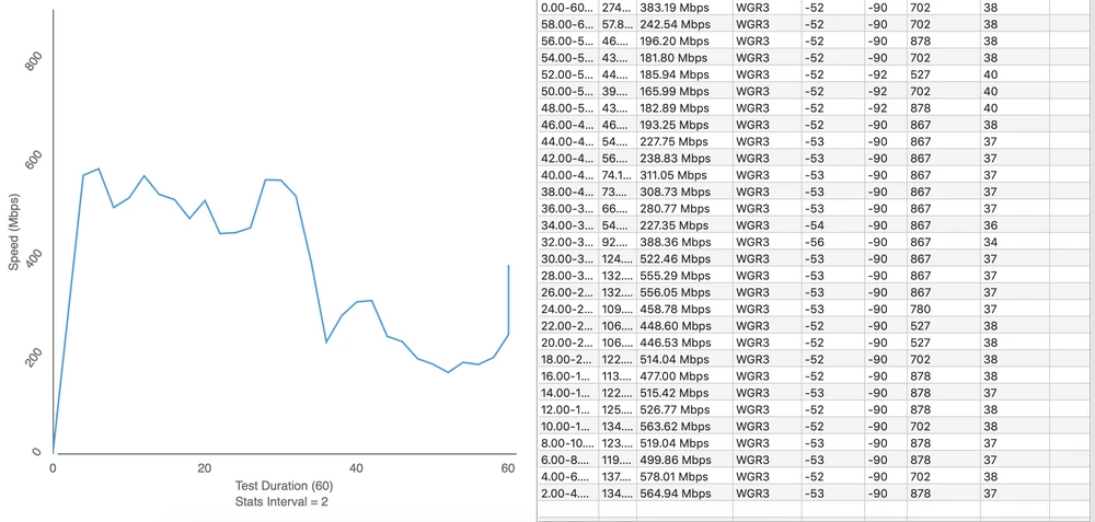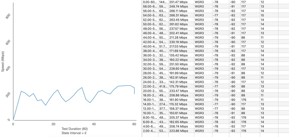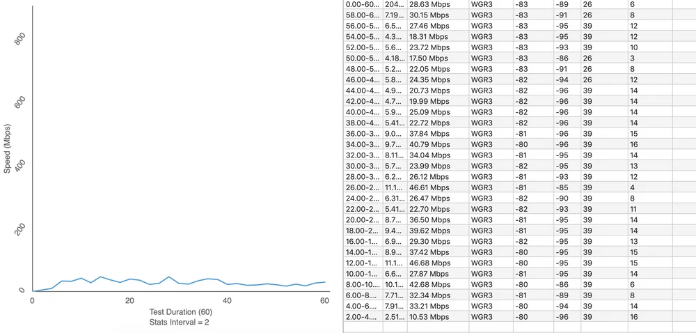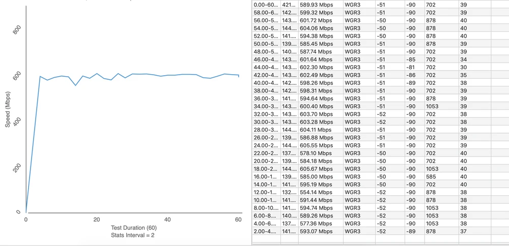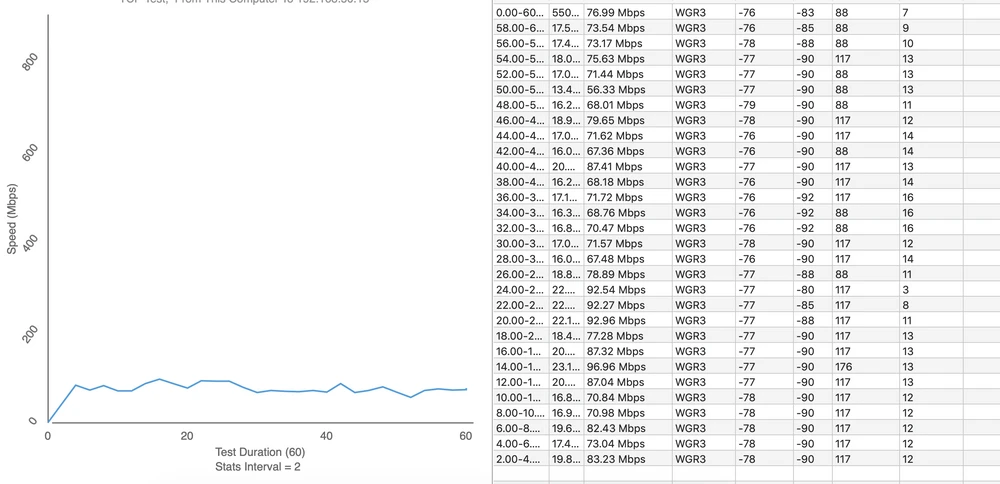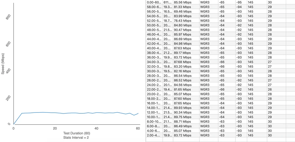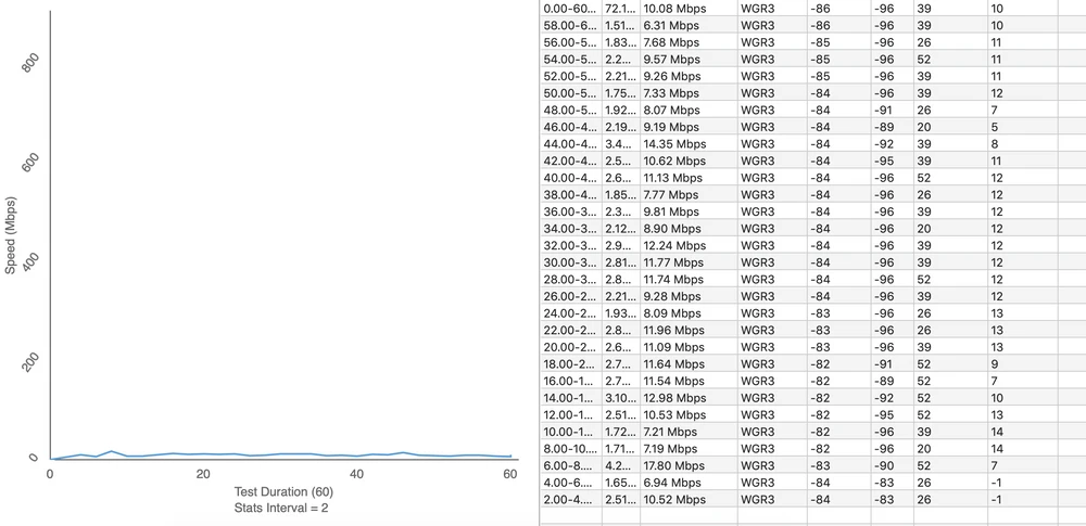 Os testes de velocidade foram realizados utilizando o software WiFiPerf, enquanto o servidor de testes de velocidade era o software iperf3. A série de testes foi realizada com base no protocolo TCP e o ciclo de duração foi de 60s.