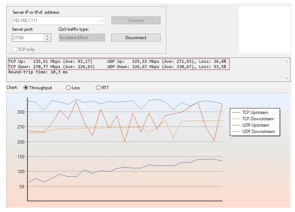 O seguinte teste foi realizado diretamente entre as antenas B5-Lite usando a ferramenta de diagnóstico de Teste de Largura de Banda, baseado no protocolo UDP e gerando pacotes de 1.500 bytes. As antenas foram definidas para o modo "Auto Tudo".