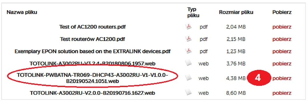 - faça o download do arquivo de software apropriado. No nosso caso, este é TOTOLINK-PWBATNA-TR069-DHCP43-A3002RU-V1-V1.0.0-B20190524.1051.web (4), porque queremos ativar a opção TR069-DHCP43