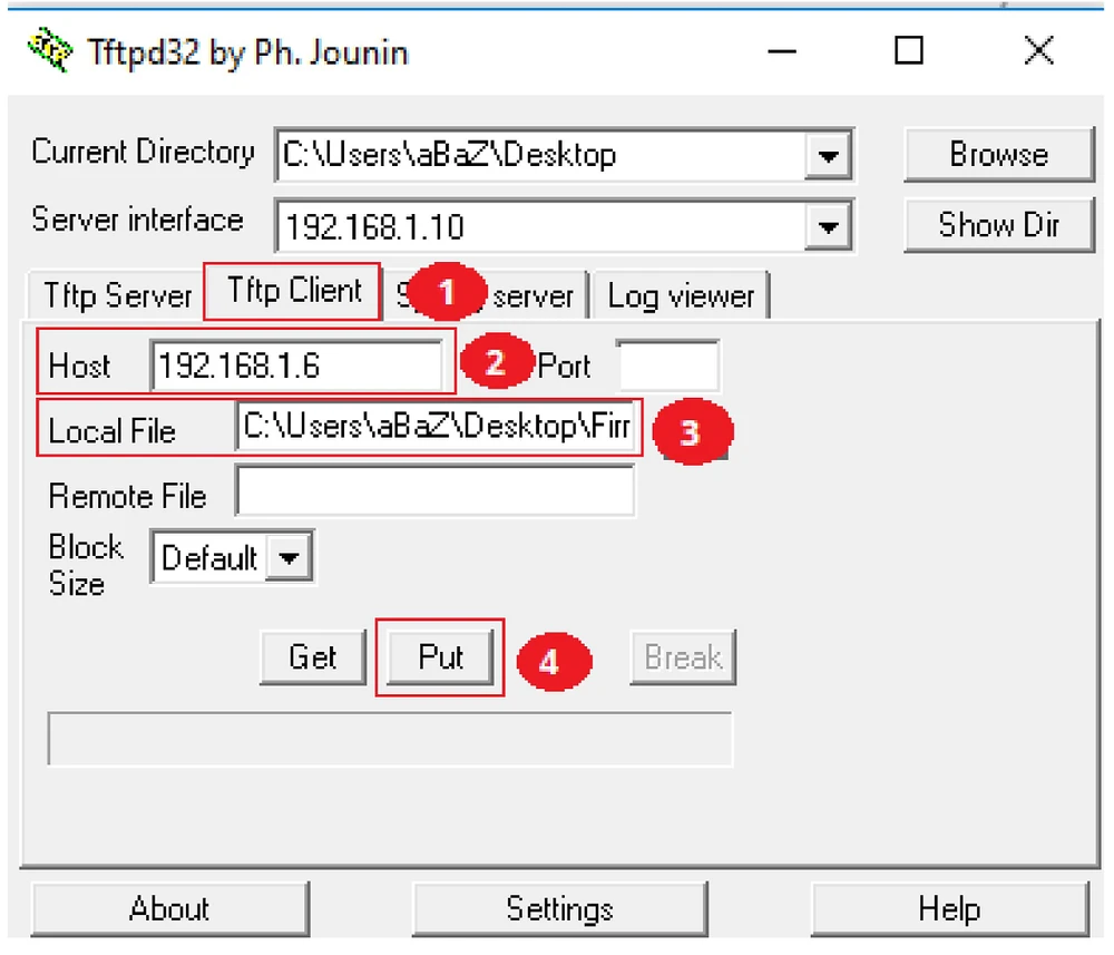 - Abra nossa aplicação TFTP e selecione o endereço 192.168.1.10 na "Interface do servidor