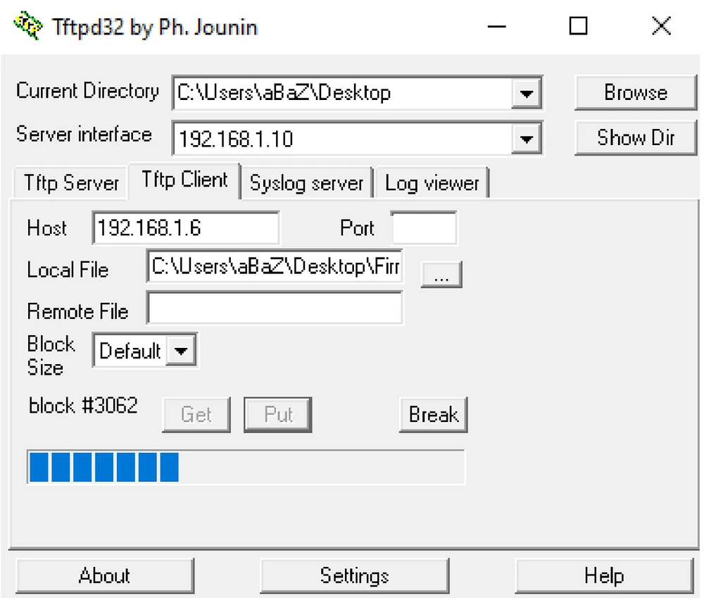 Depois de pressionarmos Put vemos bloco a bloco como o ficheiro de software é carregado no nosso router.