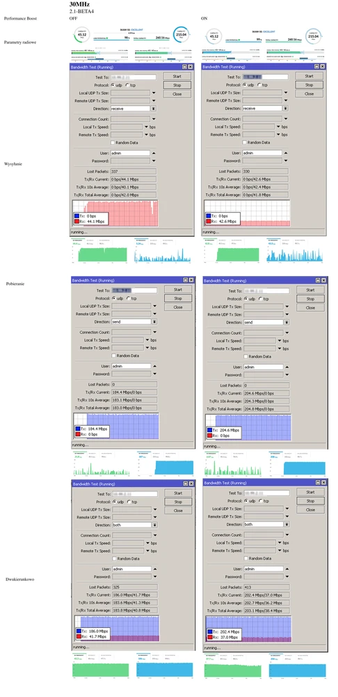 Como mencionei anteriormente, executamos os testes para diferentes versões de software, diferentes larguras de canal e com um parâmetro variável"Performance Boost". Abaixo, os resultados das velocidades de Download e Upload obtidas.|