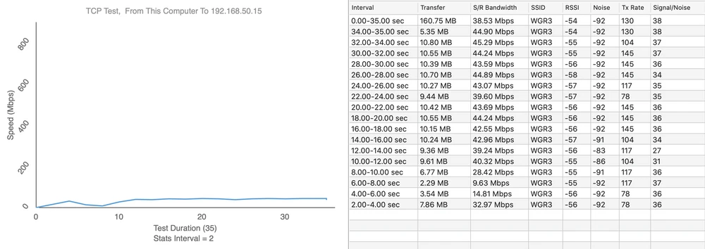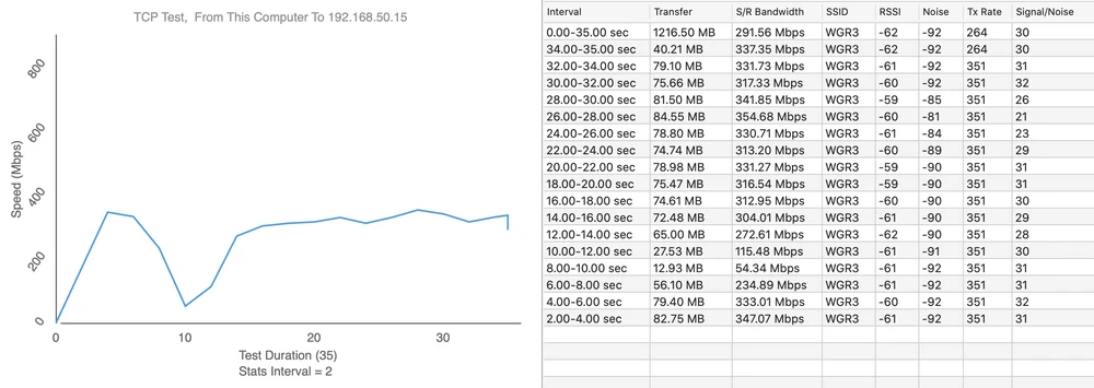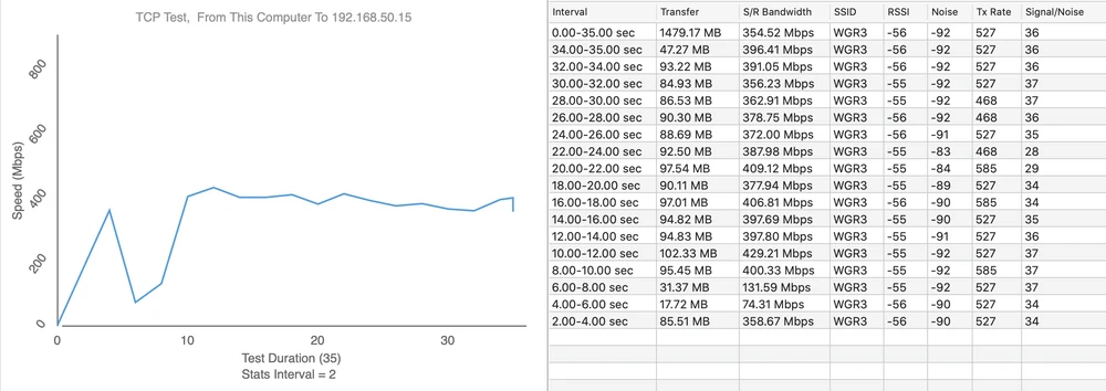 é capaz de operar na banda de 5GHz com uma largura de canal de 160MHz, mas devido ao número ainda limitado de dispositivos terminais (telefones/laptops), omitimos estes testes actualmente.O dispositivo de teste foi um MacBook Pro A1502 equipado com uma placa sem fio AirPort Extreme (Broadcom BCM4360 3x3, 1,3 Gbps PHY) funcionando nos padrões 802.11a/b/g/n/ac.