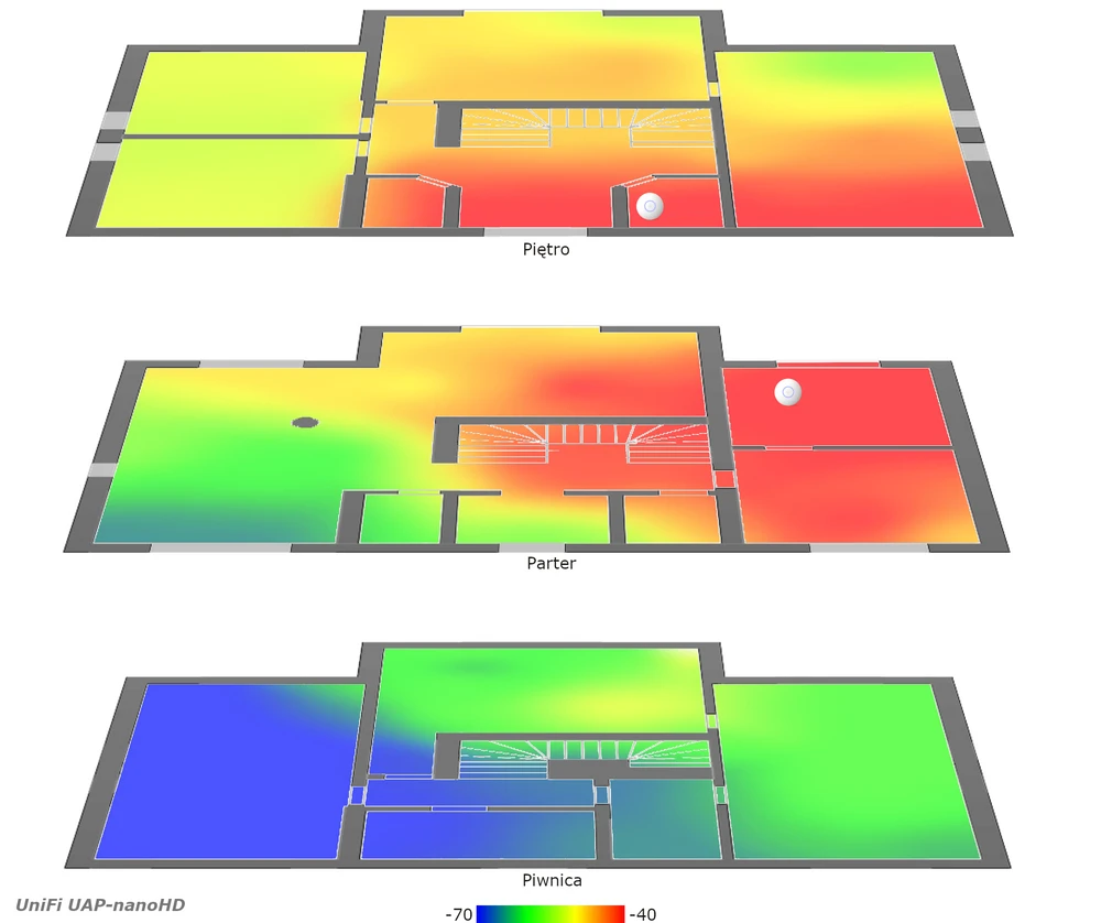 O software AirSurvey foi utilizado para realizar o mapa de sinais. Para uma leitura correcta dos níveis de sinal, preste atenção à legenda colorida na parte inferior da imagem. A colocação dos AccesPoints foi marcada com um ícone apropriado, e o dispositivo no piso térreo foi conectado ao switch através de uma porta Ethernet de 1Gbps.