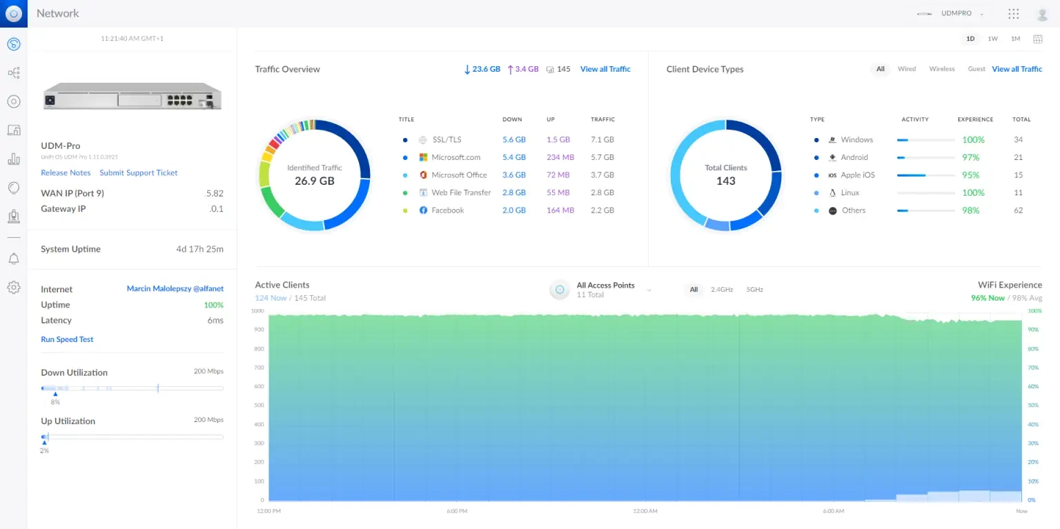 O coração do nosso sistema é o UDM-Pro, que pode servir como roteador, switch, firewall, servidor DHCP e gravador de vídeo. Graças a duas entradas WAN, é possível conectar links redundantes (backup) à Internet, por exemplo, via LTE, graças ao U-LTE-PRO. Mas a vantagem mais importante é o SO UniFi, que lhe permite gerir toda a rede, as suas configurações a partir de um web browser ou de um telemóvel, mesmo que esteja noutro país, noutro continente! Você também pode gerenciar o UniFi Access, ou seja, abrir e fechar portas, ver imagens de câmeras de segurança no UniFi Protect e muito mais a partir de um único navegador ou aplicativo móvel.