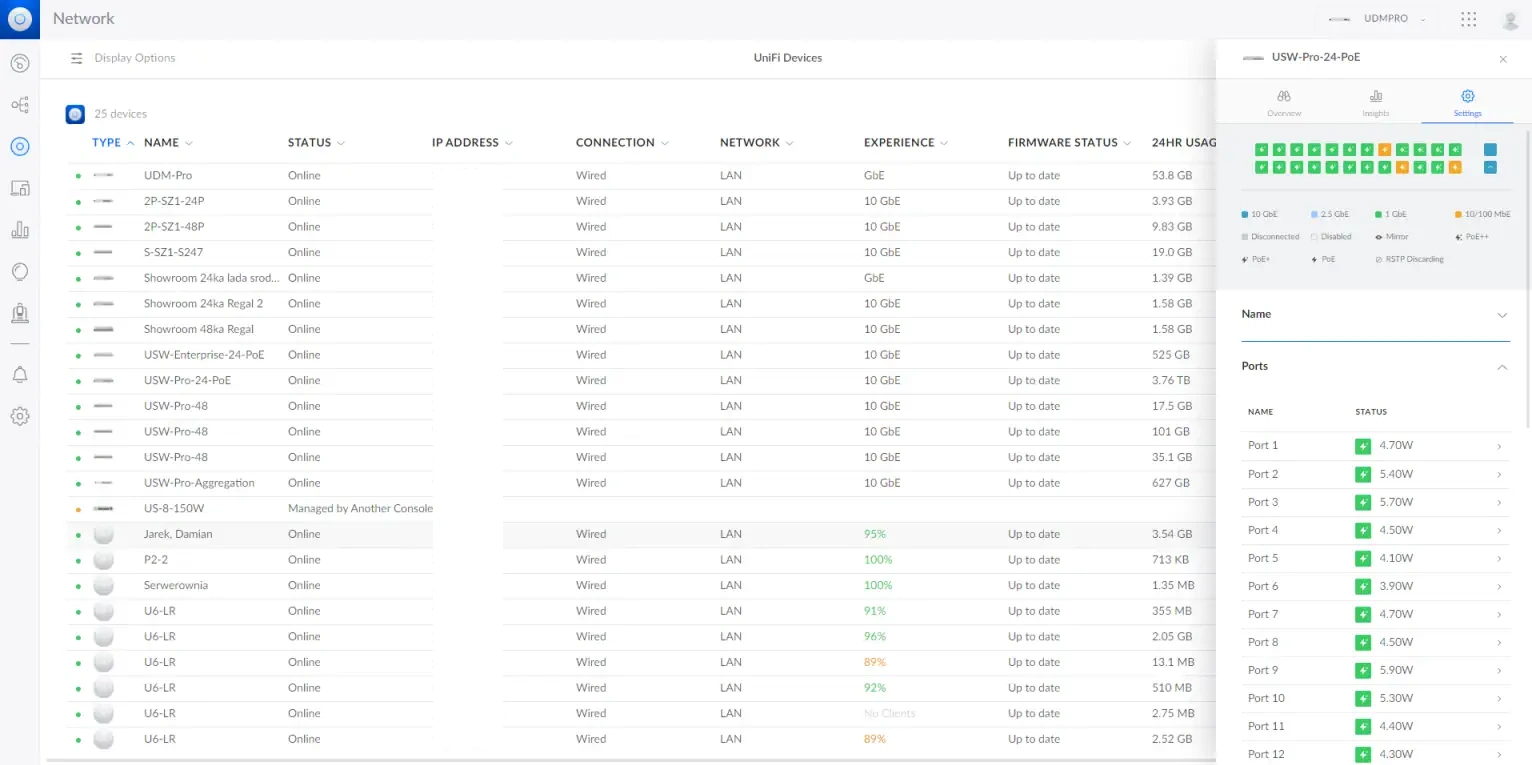Mesmo na fase de projeto da rede, utilizando a ferramenta UniFi Design Center, sabíamos exatamente quanto e que tipo de equipamento precisávamos e onde ele estava localizado. Na configuração atual, nossa rede é composta por 10 switches (48 portas e 24 portas) com e sem PoE, 24 câmeras de vídeo, 2 gravadores de vídeo, 11 pontos de acesso com Wi-Fi 6. No entanto, isso não significa o fim do projeto, pois temos outros projetos de monitoramento em mente, e o sistema UniFi permite uma fácil escalabilidade. Dúzias ou centenas de gigabytes passam por todo o sistema todos os dias, e o equipamento manuseia-o perfeitamente!