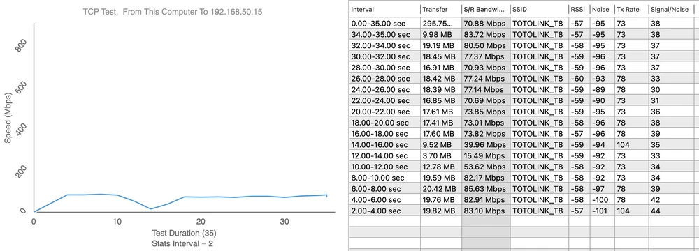 Realizamos testes de velocidade usando o software WiFiPerf, e o servidor de teste de velocidade era o software iperf3. Antes dos testes de velocidade, verificamos o desempenho máximo da LAN e do servidor iperf3:- Download 894Mbps,
