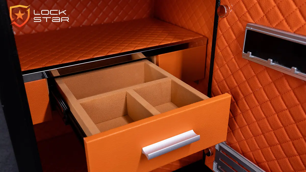 O cofre está equipado com uma tecnologia antirroubo avançada que combina separação mecânica e eléctrica. Um sistema de alarme dispara quando é tentado o acesso não autorizado, proporcionando uma proteção dupla para os artigos guardados. Além disso, o cofre tem um cacifo interno privado, permitindo que os objectos de valor mais pequenos sejam guardados em segurança num ambiente ainda mais protetor.
