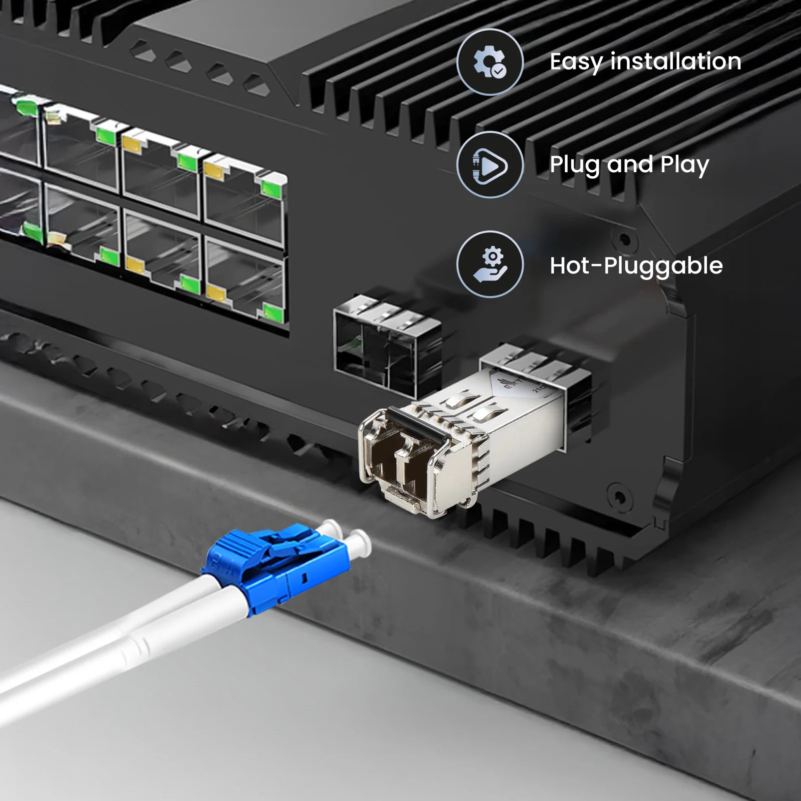 Os módulos SFP-BIDI são módulos de alto desempenho e económicos que suportam uma taxa de dados dupla de 1,25 Gbps/1,0625 Gbps e uma distância de transmissão de 20 km utilizando a tecnologia SMF. O transcetor é composto por três secções: um transmissor laser FP, um fotodíodo PIN integrado com um pré-amplificador de transimpedância (TIA) e uma unidade de controlo MCU. Todos os módulos cumprem os requisitos de segurança laser de classe I.