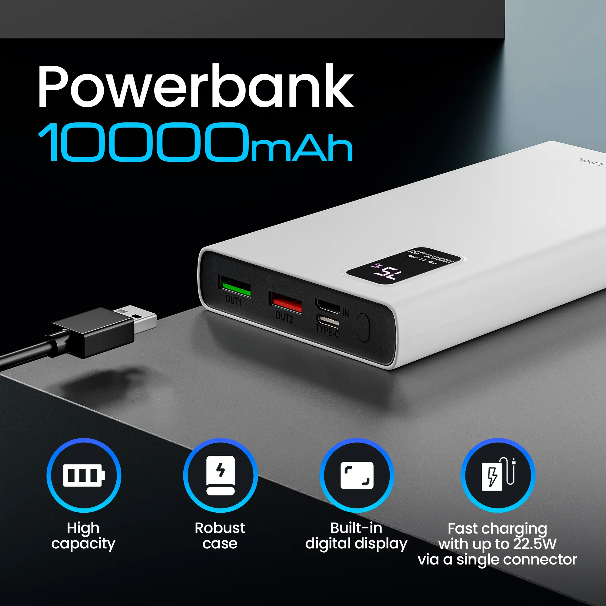 O banco de energia Extralink EPB-067W suporta uma funcionalidade de Carga Rápida de até 22,5 W através de uma única porta. A alta capacidade de 10000 mAh é suficiente para carregar um único dispositivo várias vezes, satisfazendo as necessidades energéticas do dia inteiro.