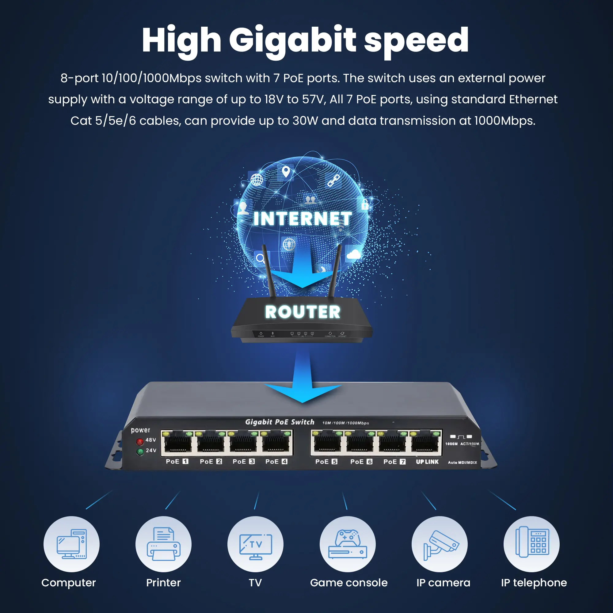 A EXTRALINK KRATOS combina um pequeno interruptor de 8 portas de alto desempenho 10/100/1000Mbps com 7 portas PoE. O interruptor utiliza uma fonte de alimentação externa com uma gama de tensão de 18V a 57V. Todas as 7 portas PoE, usando cabos Ethernet Cat 5/5e/6 padrão, podem fornecer até 30W de potência e 1000Mbps de transmissão de dados -.