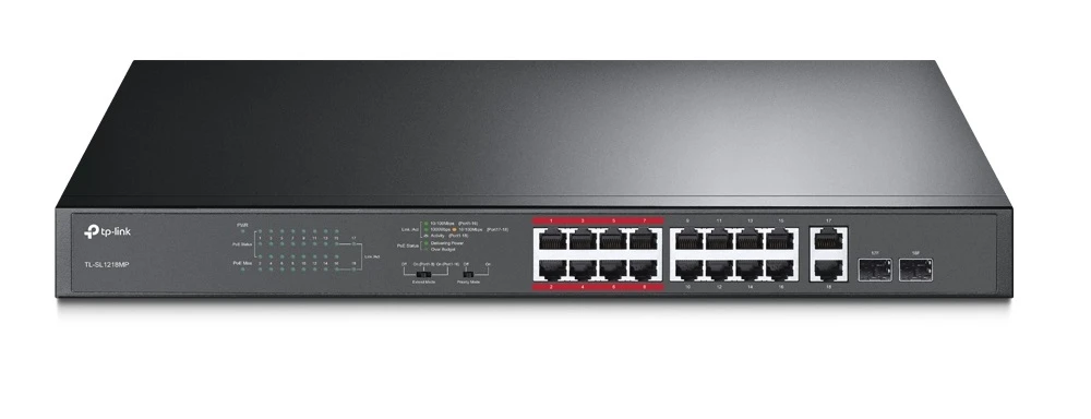 TP-LINK TL-SL1218MP é um Switch Fast Ethernet Unmanaged com 16 portas PoE+, 2 portas Gigabit RJ45 e 2 portas Gigabit SFP combo. O dispositivo permite a transmissão de energia e dados a uma distância de 250 m no modo PoE Extend. O orçamento de energia do PoE é de 192 W, ou 30 W por porto. O interruptor é fácil de usar, não requer nenhuma configuração ou instalação.