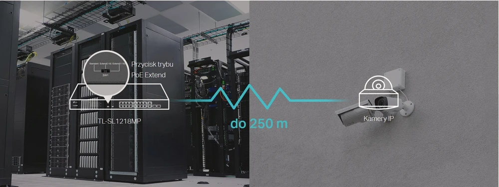 O TL-SL1218MP é projetado para necessidades de vigilância IP. Com um interruptor PoE, instalar um sistema de vigilância é fácil, seguro e menos dispendioso. Com o modo PoE Extend, o alcance da transmissão PoE é de até 250m, portanto o TL-SL1218MP é a solução perfeita quando você precisa implantar câmeras IP em uma grande área.