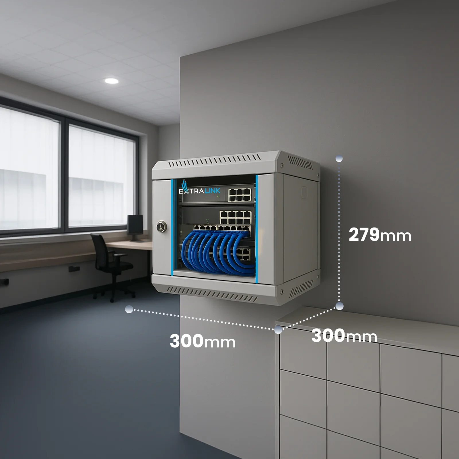 Ogabinete de rack Extralink foi concebido para montagem na parede em escritórios, salas de servidores de rede e salas de controlo CCTV. As paredes externas são feitas de chapa de aço laminada a frio. Equipado com porta frontal de vidro temperado pode abrir para o lado esquerdo ou direito.