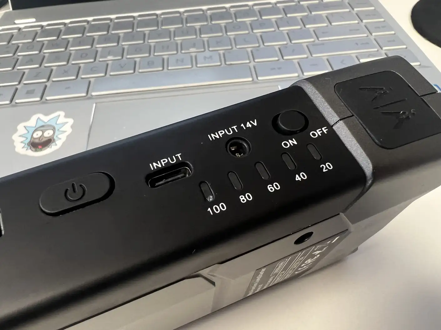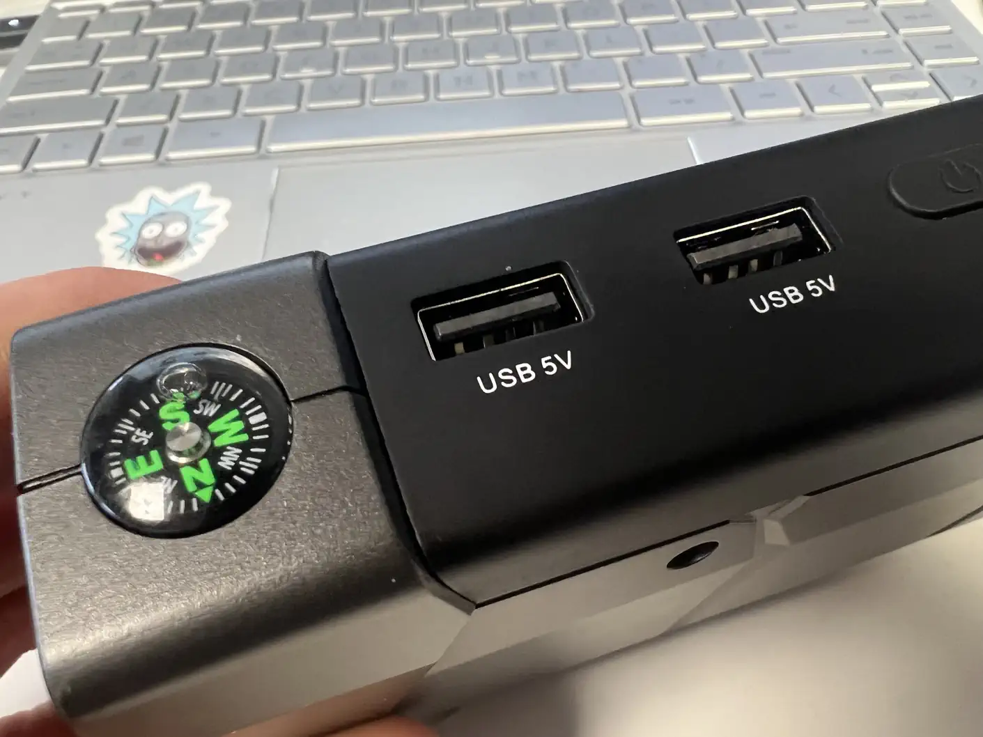 На боковой стороне устройства расположены 5-сегментный индикатор заряда батареи; 2 разъема USB для зарядки других устройств; разъем типа C для зарядки бустера; разъем Jack для зарядки 14 В (не входит в комплект); кнопка включения - выключения; кнопка переключения режимов фонарика и бустера; компас.