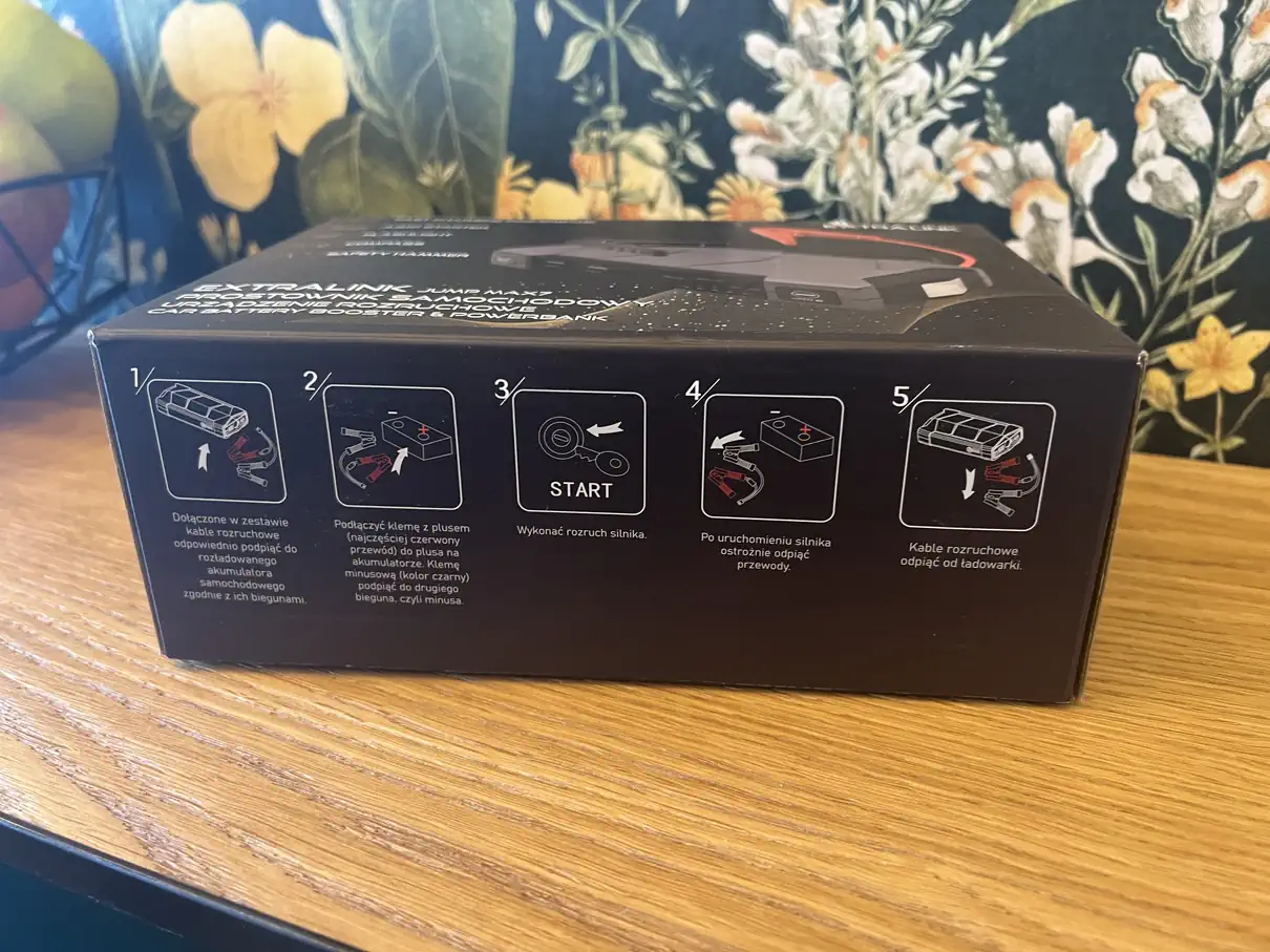 Усилитель Extralink Jump MAX7 поставляется в плотной картонной коробке с приятным темным принтом. На лицевой стороне есть фотография самого бустера и краткое описание. На задней стороне находится спецификация на польском и английском языках. Также на одной стороне напечатана и показана краткая инструкция в 5 шагов о том, как использовать устройство для запуска автомобиля с разряженным аккумулятором.