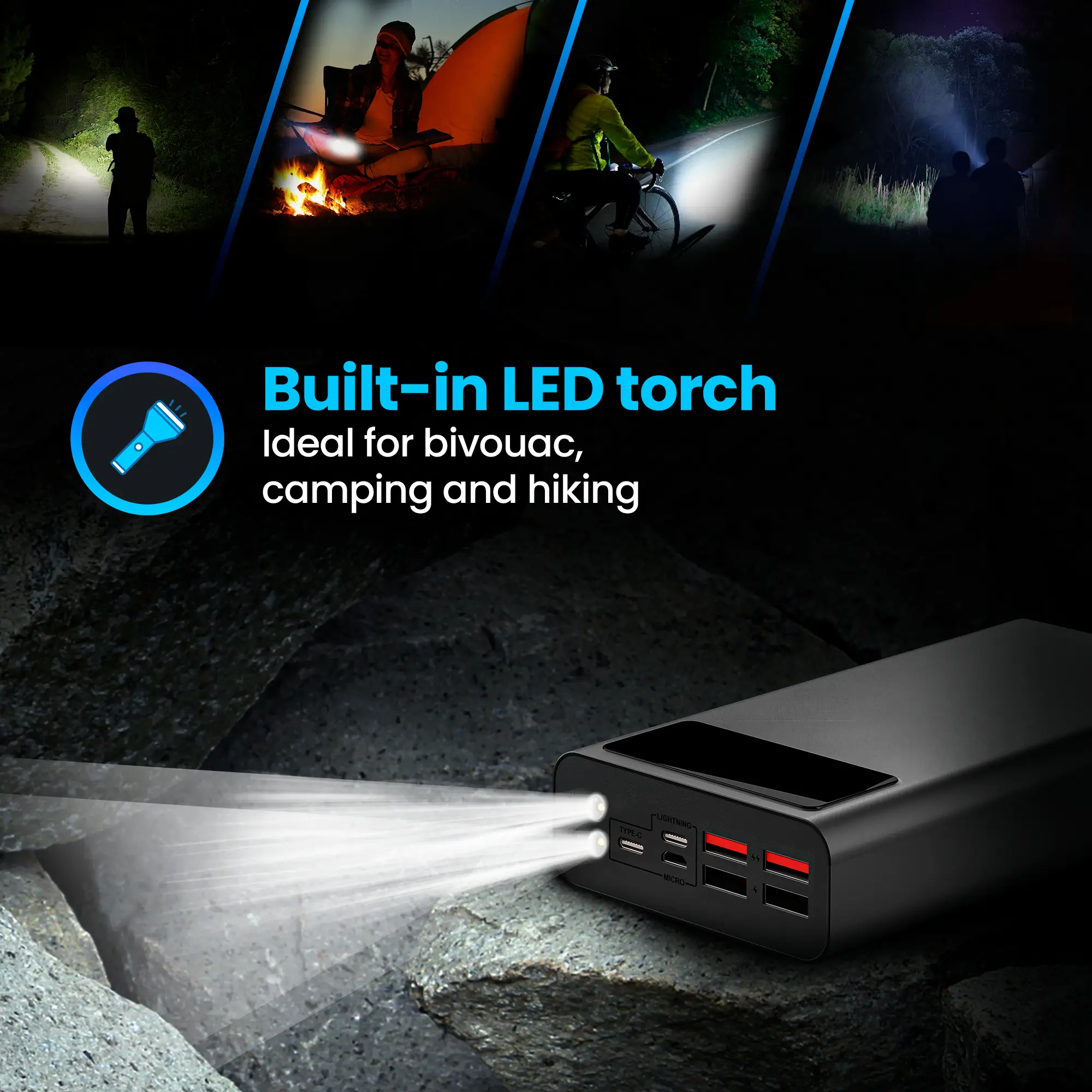 Цифровой дисплей показывает уровень заряда power bank, светодиодный фонарик пригодится в походе.