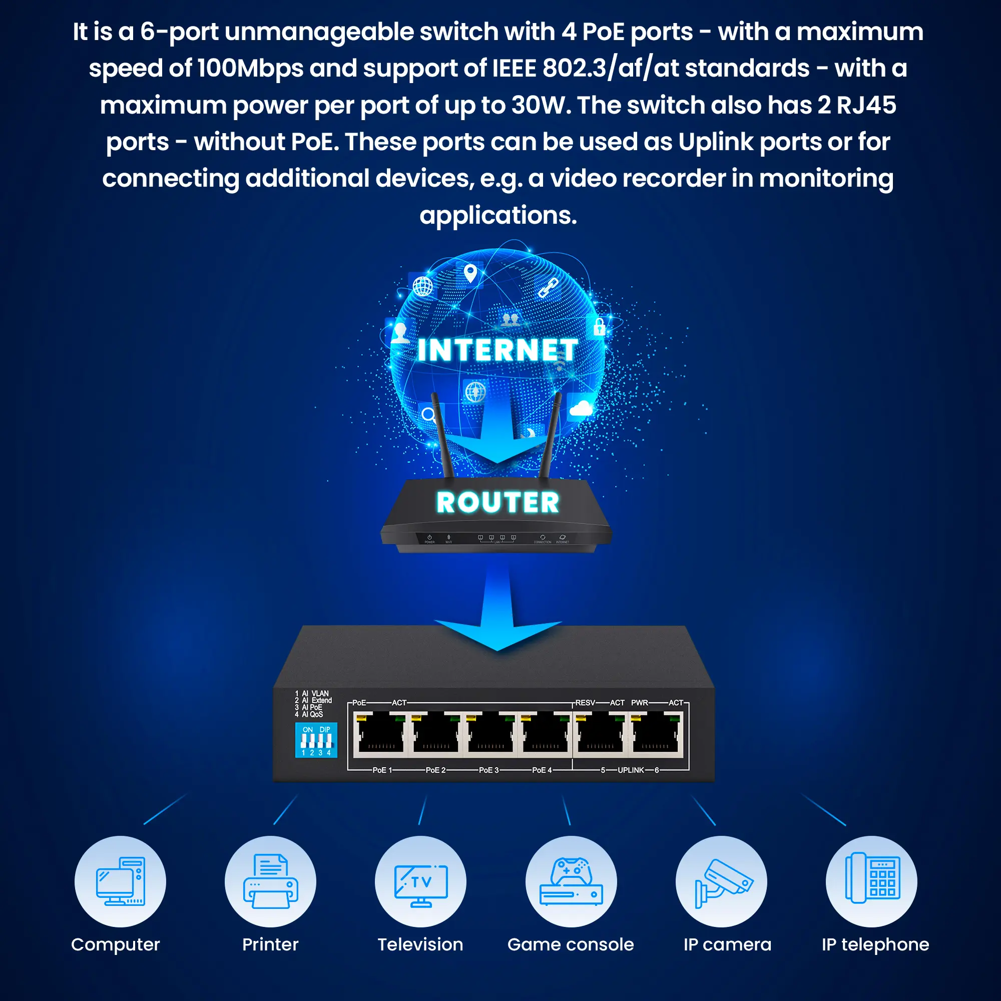 Extralink KRIOS Switch PoE 4x Gigabit PoE/PoE+, 2x RJ45 Uplink Gigabit, 60W