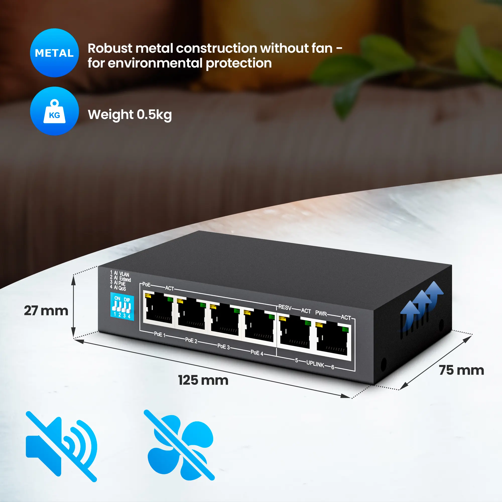 Extralink Krios - это 6-портовый неуправляемый коммутатор с 4 портами PoE с максимальной скоростью 1000 Мбит/с и поддержкой стандартов IEEE 802.3af/at с максимальной мощностью на порт 30 Вт.