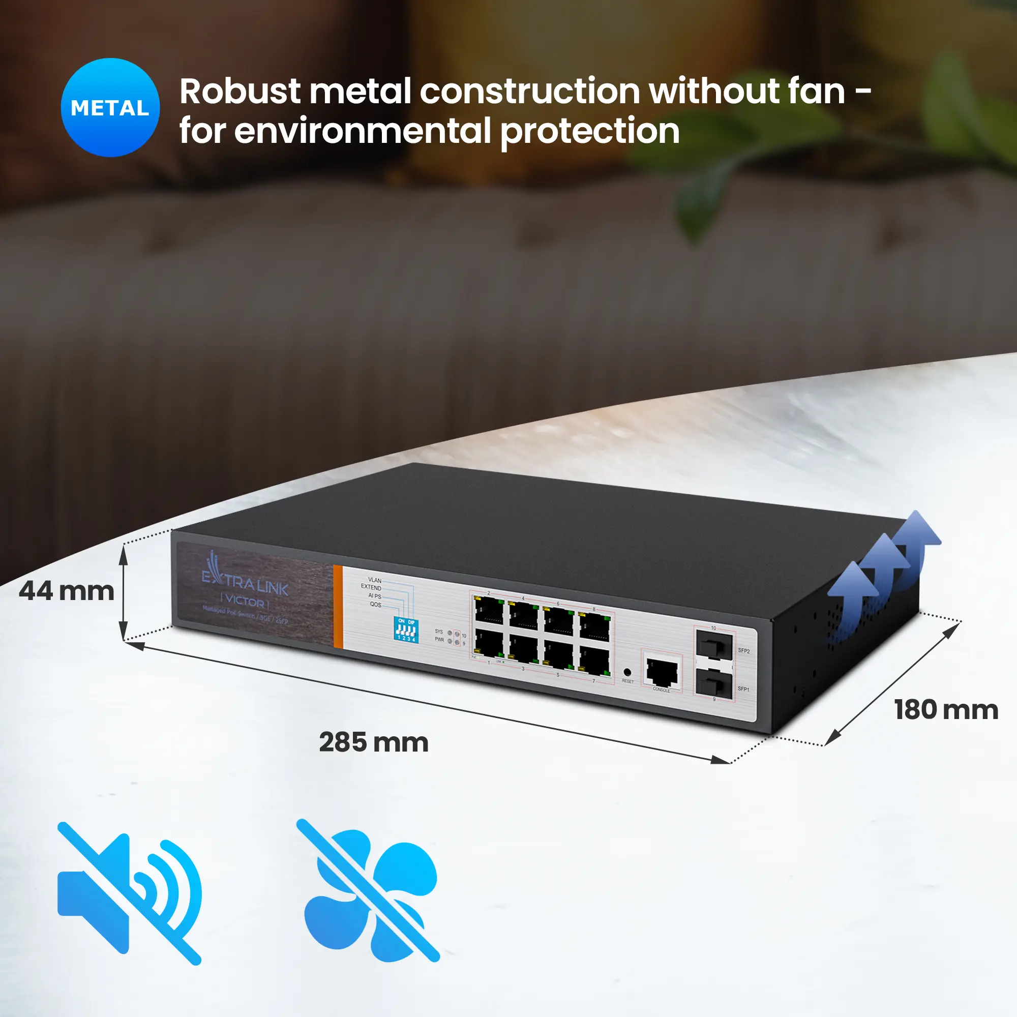 Коммутатор PoE Extralink VICTOR, 8x Gigabit PoE/PoE+, 2x SFP, 1x Консольный Порт, 150W, Управляемый