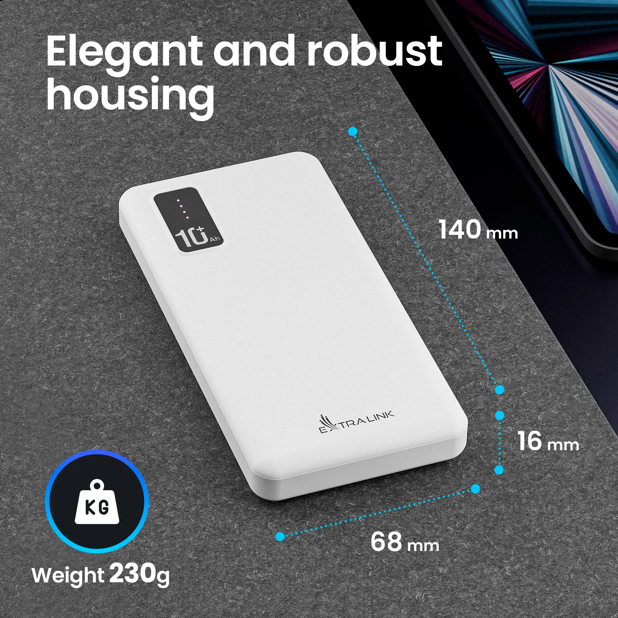 Extralink EPB-098W güç bankası, bir akıllı telefonu veya tableti birçok kez şarj etmek için yeterli 10.000 mAh kapasiteye sahiptir.