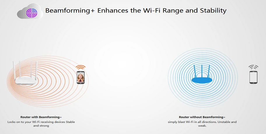 Geliştirilmiş BeamForming + teknolojisi, sinyal aralığını ve bağlantı kararlılığını artırır. Standart bir yönlendirici sinyali uzayda eşit olarak iletirken, Breamforming + içeren bir model, daha güçlü bir sinyalin yönlendirildiği bağlı bir cihazı bulabilir.
