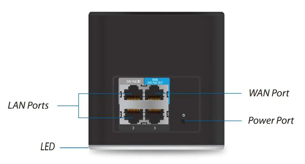Ubiquiti airCube AC, doğrudan Ethernet kablosuyla güç kaynağıyla airMax erişim noktasının rahat ve sorunsuz kurulumunu sağlayan Power over Ethernet (24V PoE) destekleyen iki bağlantı noktasıyla donatılmıştır.